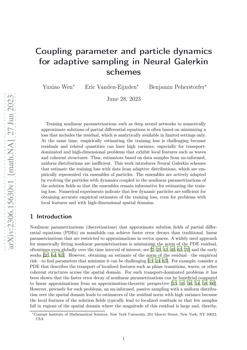 Training nonlinear parametrizations such as deep neural networks to numerically approximate solutions of partial differential equations is often based on minimizing a loss that includes the residual, which is analytically available in limited settings only. At the same time, empirically estimating the training loss is challenging because residuals and related quantities can have high variance, especially for transport-dominated and high-dimensional problems that exhibit local features such as waves and coherent structures. Thus, estimators based on data samples from un-informed, uniform distributions are inefficient. This work introduces Neural Galerkin schemes that estimate the training loss with data from adaptive distributions, which are empirically represented via ensembles of particles. The ensembles are actively adapted by evolving the particles with dynamics coupled to the nonlinear parametrizations of the solution fields so that the ensembles remain informative for estimating the training loss. Numerical experiments indicate that few dynamic particles are sufficient for obtaining accurate empirical estimates of the training loss, even for problems with local features and with high-dimensional spatial domains.