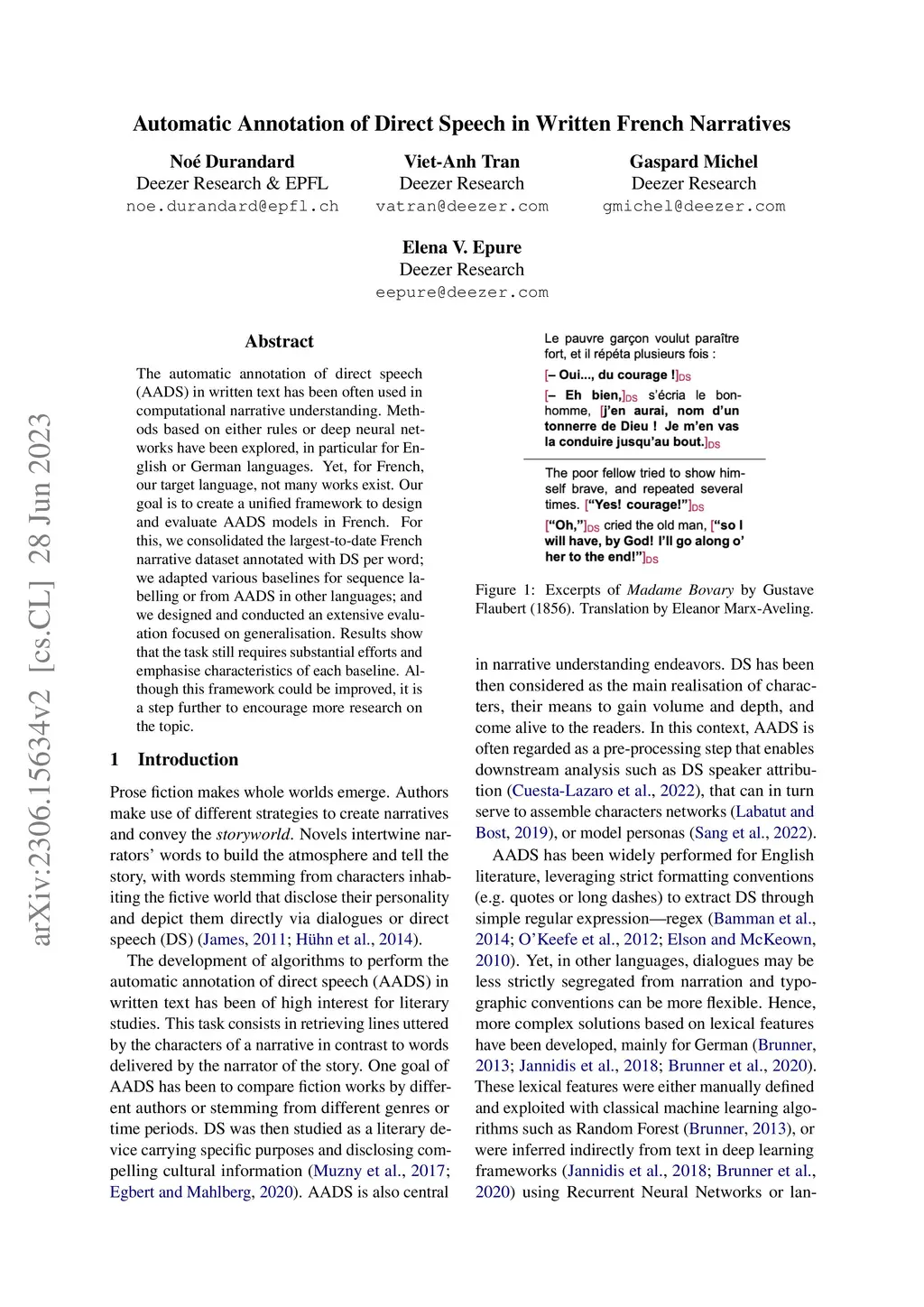 The automatic annotation of direct speech (AADS) in written text has been often used in computational narrative understanding. Methods based on either rules or deep neural networks have been explored, in particular for English or German languages. Yet, for French, our target language, not many works exist. Our goal is to create a unified framework to design and evaluate AADS models in French. For this, we consolidated the largest-to-date French narrative dataset annotated with DS per word; we adapted various baselines for sequence labelling or from AADS in other languages; and we designed and conducted an extensive evaluation focused on generalisation. Results show that the task still requires substantial efforts and emphasise characteristics of each baseline. Although this framework could be improved, it is a step further to encourage more research on the topic.