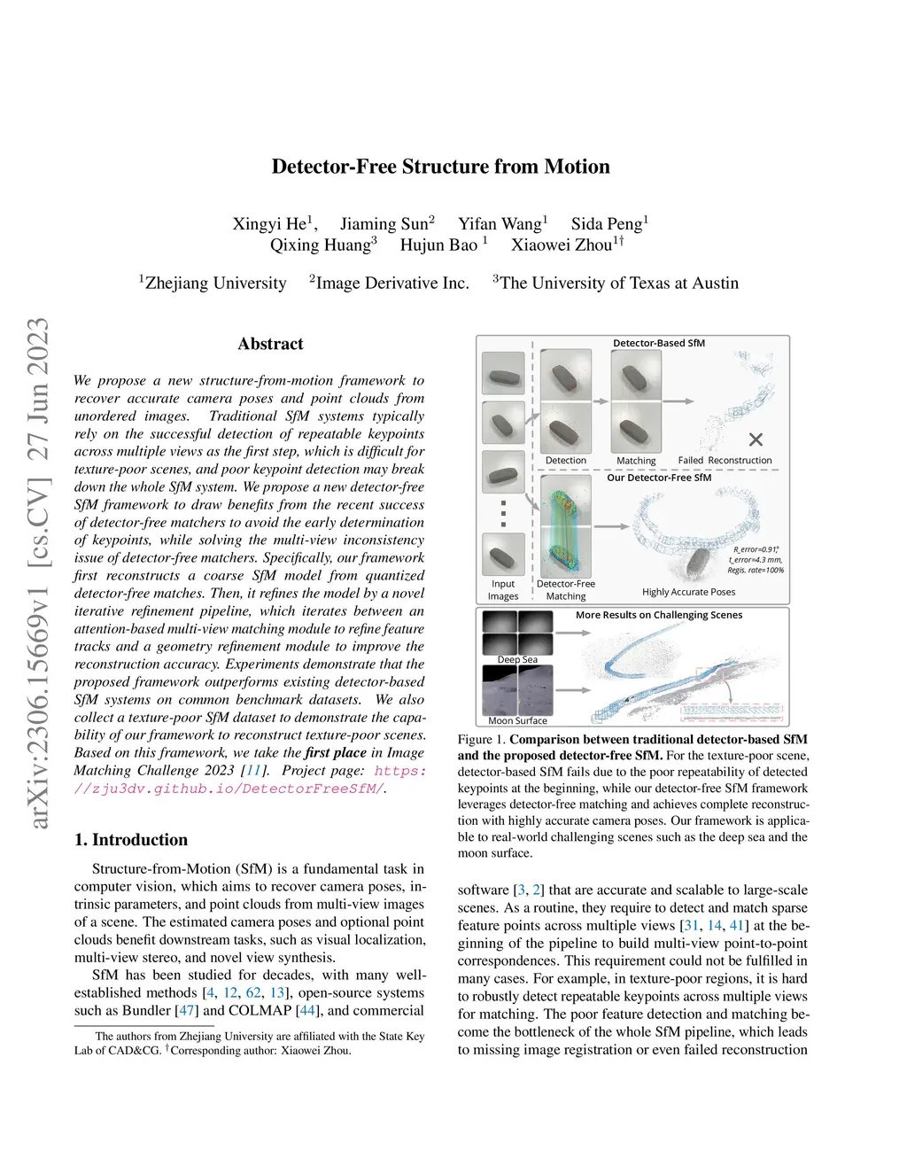 We propose a new structure-from-motion framework to recover accurate camera poses and point clouds from unordered images. Traditional SfM systems typically rely on the successful detection of repeatable keypoints across multiple views as the first step, which is difficult for texture-poor scenes, and poor keypoint detection may break down the whole SfM system. We propose a new detector-free SfM framework to draw benefits from the recent success of detector-free matchers to avoid the early determination of keypoints, while solving the multi-view inconsistency issue of detector-free matchers. Specifically, our framework first reconstructs a coarse SfM model from quantized detector-free matches. Then, it refines the model by a novel iterative refinement pipeline, which iterates between an attention-based multi-view matching module to refine feature tracks and a geometry refinement module to improve the reconstruction accuracy. Experiments demonstrate that the proposed framework outperforms existing detector-based SfM systems on common benchmark datasets. We also collect a texture-poor SfM dataset to demonstrate the capability of our framework to reconstruct texture-poor scenes. Based on this framework, we take in Image Matching Challenge 2023.