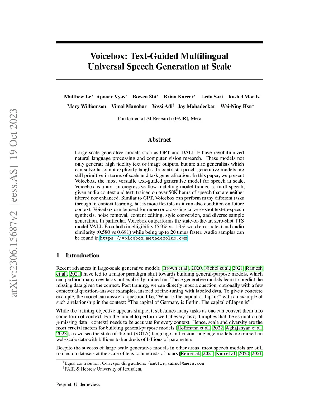 Voicebox: Text-Guided Multilingual Universal Speech Generation at Scale