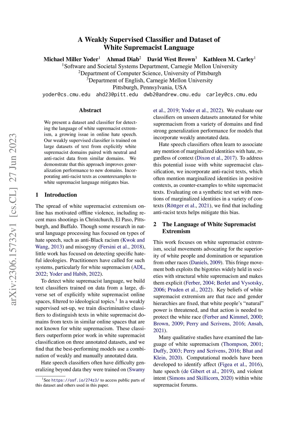 A Weakly Supervised Classifier and Dataset of White Supremacist Language