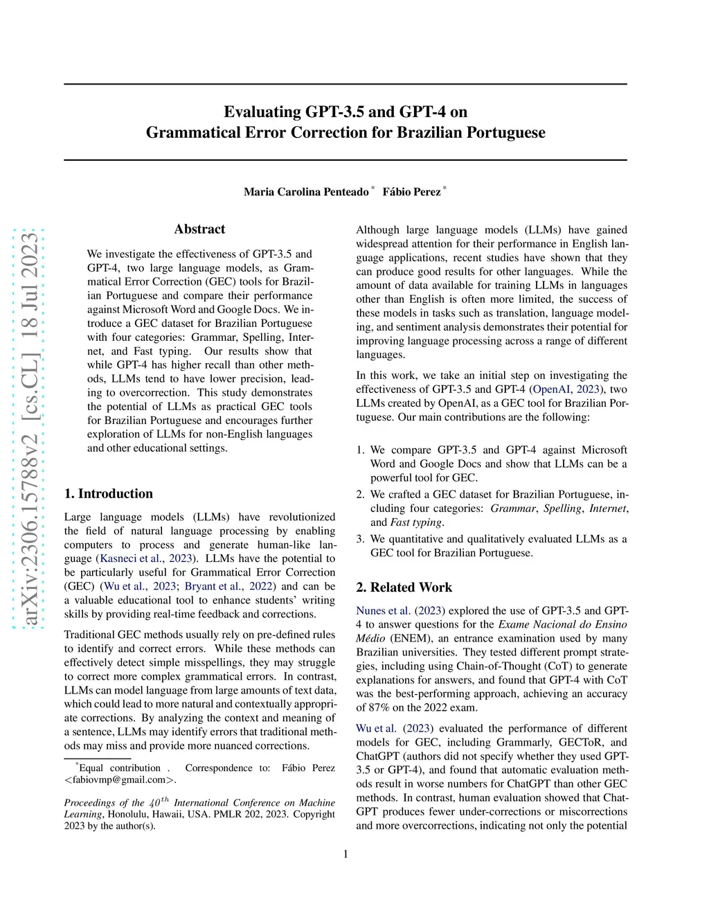 We investigate the effectiveness of GPT-3.5 and GPT-4, two large language models, as Grammatical Error Correction (GEC) tools for Brazilian Portuguese and compare their performance against Microsoft Word and Google Docs. We introduce a GEC dataset for Brazilian Portuguese with four categories: Grammar, Spelling, Internet, and Fast typing. Our results show that while GPT-4 has higher recall than other methods, LLMs tend to have lower precision, leading to overcorrection. This study demonstrates the potential of LLMs as practical GEC tools for Brazilian Portuguese and encourages further exploration of LLMs for non-English languages and other educational settings.