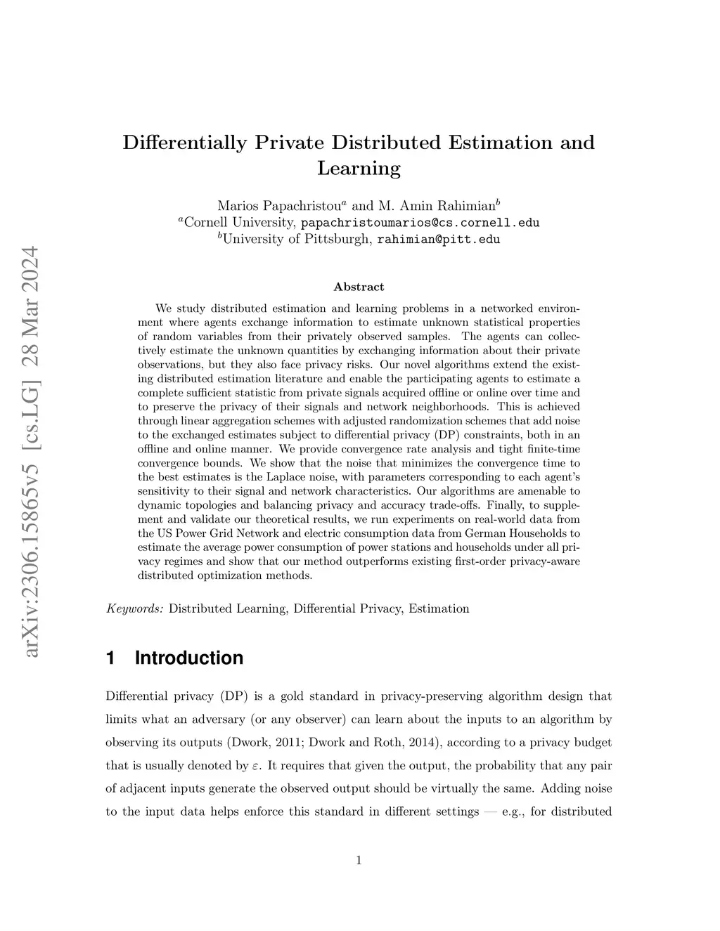 We study distributed estimation and learning problems in a networked environment where agents exchange information to estimate unknown statistical properties of random variables from their privately observed samples. The agents can collectively estimate the unknown quantities by exchanging information about their private observations, but they also face privacy risks. Our novel algorithms extend the existing distributed estimation literature and enable the participating agents to estimate a complete sufficient statistic from private signals acquired offline or online over time and to preserve the privacy of their signals and network neighborhoods. This is achieved through linear aggregation schemes with adjusted randomization schemes that add noise to the exchanged estimates subject to differential privacy (DP) constraints, both in an offline and online manner. We provide convergence rate analysis and tight finite-time convergence bounds. We show that the noise that minimizes the convergence time to the best estimates is the Laplace noise, with parameters corresponding to each agent's sensitivity to their signal and network characteristics. Our algorithms are amenable to dynamic topologies and balancing privacy and accuracy trade-offs. Finally, to supplement and validate our theoretical results, we run experiments on real-world data from the US Power Grid Network and electric consumption data from German Households to estimate the average power consumption of power stations and households under all privacy regimes and show that our method outperforms existing first-order, privacy-aware, distributed optimization methods.