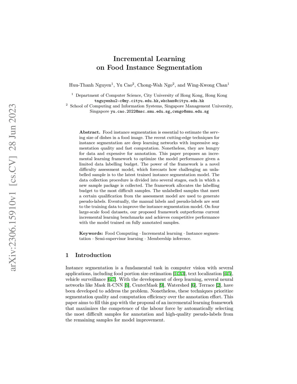 Food instance segmentation is essential to estimate the serving size of dishes in a food image. The recent cutting-edge techniques for instance segmentation are deep learning networks with impressive segmentation quality and fast computation. Nonetheless, they are hungry for data and expensive for annotation. This paper proposes an incremental learning framework to optimize the model performance given a limited data labelling budget. The power of the framework is a novel difficulty assessment model, which forecasts how challenging an unlabelled sample is to the latest trained instance segmentation model. The data collection procedure is divided into several stages, each in which a new sample package is collected. The framework allocates the labelling budget to the most difficult samples. The unlabelled samples that meet a certain qualification from the assessment model are used to generate pseudo-labels. Eventually, the manual labels and pseudo-labels are sent to the training data to improve the instance segmentation model. On four large-scale food datasets, our proposed framework outperforms current incremental learning benchmarks and achieves competitive performance with the model trained on fully annotated samples.