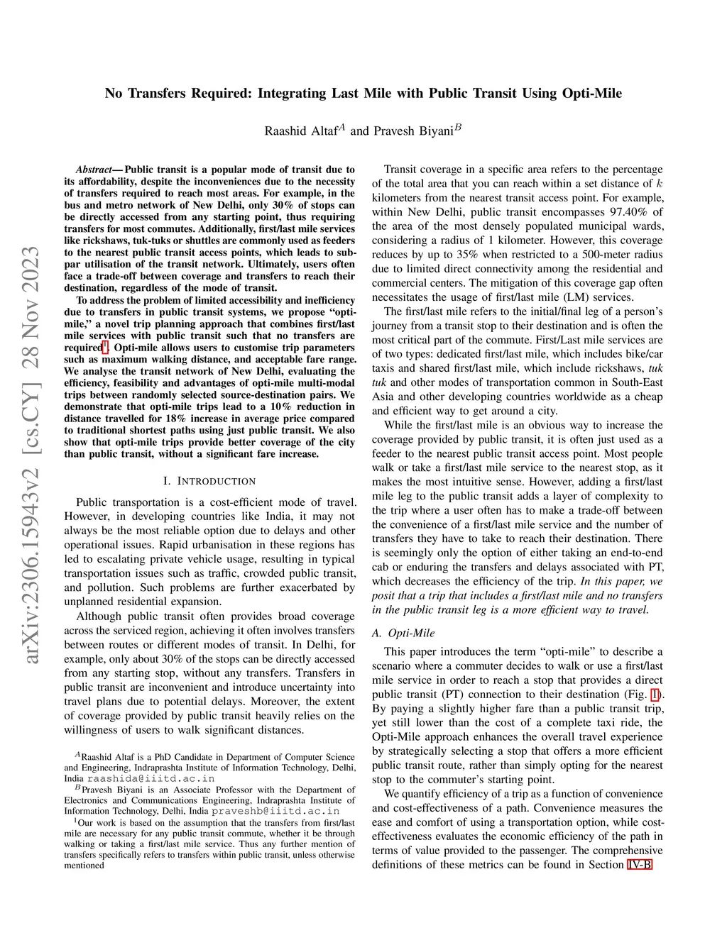 Public transit is a popular mode of transit due to its affordability, despite the inconveniences due to the necessity of transfers required to reach most areas. For example, in the bus and metro network of New Delhi, only 30% of stops can be directly accessed from any starting point, thus requiring transfers for most commutes. Additionally, last-mile services like rickshaws, tuk-tuks or shuttles are commonly used as feeders to the nearest public transit access points, which further adds to the complexity and inefficiency of a journey. Ultimately, users often face a tradeoff between coverage and transfers to reach their destination, regardless of the mode of transit or the use of last-mile services. To address the problem of limited accessibility and inefficiency due to transfers in public transit systems, we propose ``opti-mile," a novel trip planning approach that combines last-mile services with public transit such that no transfers are required. Opti-mile allows users to customise trip parameters such as maximum walking distance, and acceptable fare range. We analyse the transit network of New Delhi, evaluating the efficiency, feasibility and advantages of opti-mile for optimal multi-modal trips between randomly selected source-destination pairs. We demonstrate that opti-mile trips lead to a 10% reduction in distance travelled for 18% increase in price compared to traditional shortest paths. We also show that opti-mile trips provide better coverage of the city than public transit, without a significant fare increase.