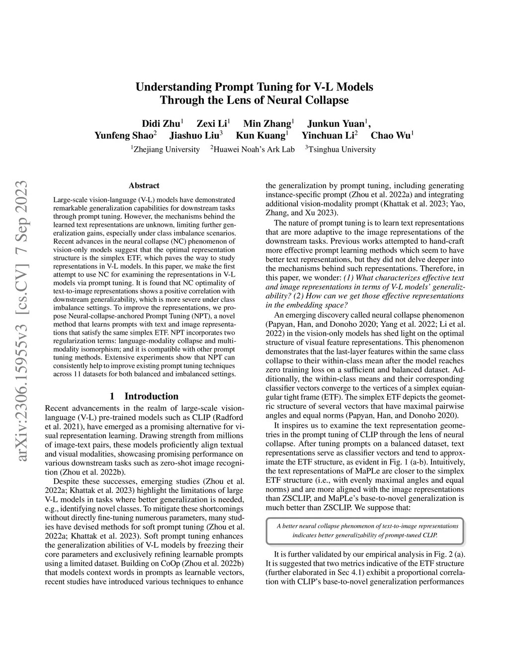 Large-scale vision-language (V-L) models have demonstrated remarkable generalization capabilities for downstream tasks through prompt tuning. However, the mechanisms behind the learned text representations are unknown, limiting further generalization gains, especially under class imbalance scenarios. Recent advances in the neural collapse (NC) phenomenon of vision-only models suggest that the optimal representation structure is the simplex ETF, which paves the way to study representations in V-L models. In this paper, we make the first attempt to use NC for examining the representations in V-L models via prompt tuning. It is found that NC optimality of text-to-image representations shows a positive correlation with downstream generalizability, which is more severe under class imbalance settings. To improve the representations, we propose Neural-collapse-anchored Prompt Tuning (NPT), a novel method that learns prompts with text and image representations that satisfy the same simplex ETF. NPT incorporates two regularization terms: language-modality collapse and multi-modality isomorphism; and it is compatible with other prompt tuning methods. Extensive experiments show that NPT can consistently help to improve existing prompt tuning techniques across 11 datasets for both balanced and imbalanced settings.
