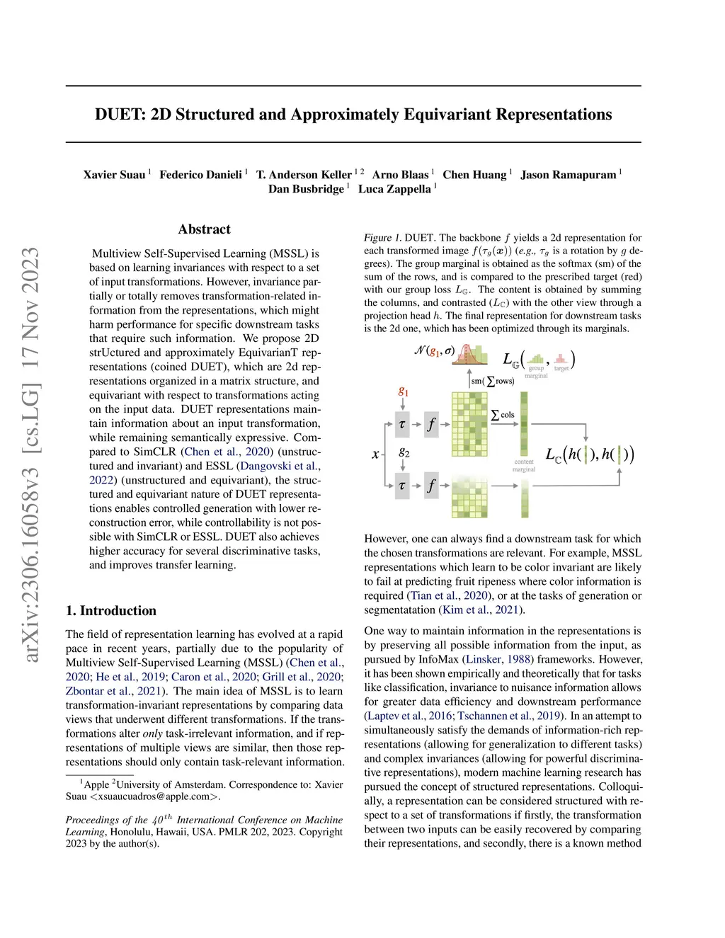 Multiview Self-Supervised Learning (MSSL) is based on learning invariances with respect to a set of input transformations. However, invariance partially or totally removes transformation-related information from the representations, which might harm performance for specific downstream tasks that require such information. We propose 2D strUctured and EquivarianT representations (coined DUET), which are 2d representations organized in a matrix structure, and equivariant with respect to transformations acting on the input data. DUET representations maintain information about an input transformation, while remaining semantically expressive. Compared to SimCLR (Chen et al., 2020) (unstructured and invariant) and ESSL (Dangovski et al., 2022) (unstructured and equivariant), the structured and equivariant nature of DUET representations enables controlled generation with lower reconstruction error, while controllability is not possible with SimCLR or ESSL. DUET also achieves higher accuracy for several discriminative tasks, and improves transfer learning.
