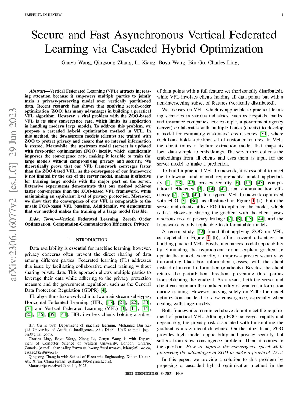 Vertical Federated Learning (VFL) attracts increasing attention because it empowers multiple parties to jointly train a privacy-preserving model over vertically partitioned data. Recent research has shown that applying zeroth-order optimization (ZOO) has many advantages in building a practical VFL algorithm. However, a vital problem with the ZOO-based VFL is its slow convergence rate, which limits its application in handling modern large models. To address this problem, we propose a cascaded hybrid optimization method in VFL. In this method, the downstream models (clients) are trained with ZOO to protect privacy and ensure that no internal information is shared. Meanwhile, the upstream model (server) is updated with first-order optimization (FOO) locally, which significantly improves the convergence rate, making it feasible to train the large models without compromising privacy and security. We theoretically prove that our VFL framework converges faster than the ZOO-based VFL, as the convergence of our framework is not limited by the size of the server model, making it effective for training large models with the major part on the server. Extensive experiments demonstrate that our method achieves faster convergence than the ZOO-based VFL framework, while maintaining an equivalent level of privacy protection. Moreover, we show that the convergence of our VFL is comparable to the unsafe FOO-based VFL baseline. Additionally, we demonstrate that our method makes the training of a large model feasible.