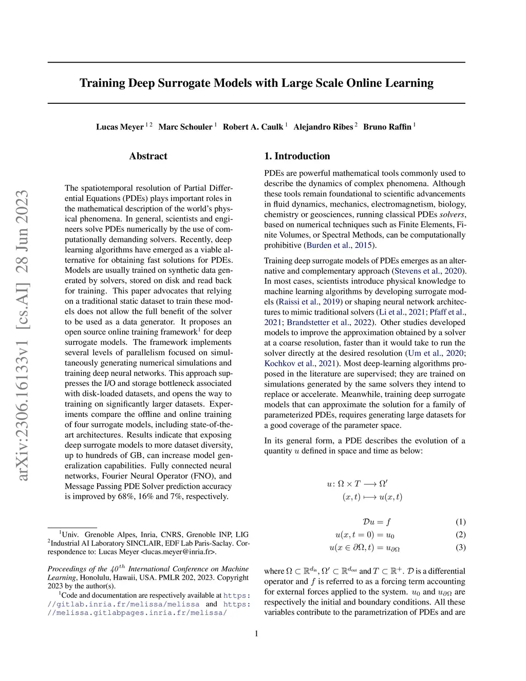 The spatiotemporal resolution of Partial Differential Equations (PDEs) plays important roles in the mathematical description of the world's physical phenomena. In general, scientists and engineers solve PDEs numerically by the use of computationally demanding solvers. Recently, deep learning algorithms have emerged as a viable alternative for obtaining fast solutions for PDEs. Models are usually trained on synthetic data generated by solvers, stored on disk and read back for training. This paper advocates that relying on a traditional static dataset to train these models does not allow the full benefit of the solver to be used as a data generator. It proposes an open source online training framework for deep surrogate models. The framework implements several levels of parallelism focused on simultaneously generating numerical simulations and training deep neural networks. This approach suppresses the I/O and storage bottleneck associated with disk-loaded datasets, and opens the way to training on significantly larger datasets. Experiments compare the offline and online training of four surrogate models, including state-of-the-art architectures. Results indicate that exposing deep surrogate models to more dataset diversity, up to hundreds of GB, can increase model generalization capabilities. Fully connected neural networks, Fourier Neural Operator (FNO), and Message Passing PDE Solver prediction accuracy is improved by 68%, 16% and 7%, respectively.