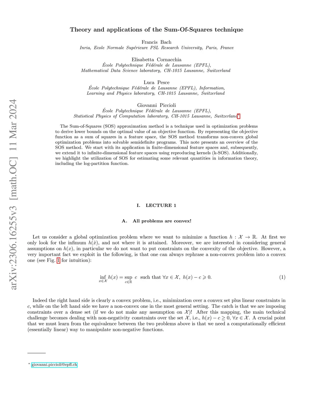 The Sum-of-Squares (SOS) approximation method is a technique used in optimization problems to derive lower bounds on the optimal value of an objective function. By representing the objective function as a sum of squares in a feature space, the SOS method transforms non-convex global optimization problems into solvable semidefinite programs. This note presents an overview of the SOS method. We start with its application in finite-dimensional feature spaces and, subsequently, we extend it to infinite-dimensional feature spaces using reproducing kernels (k-SOS). Additionally, we highlight the utilization of SOS for estimating some relevant quantities in information theory, including the log-partition function.