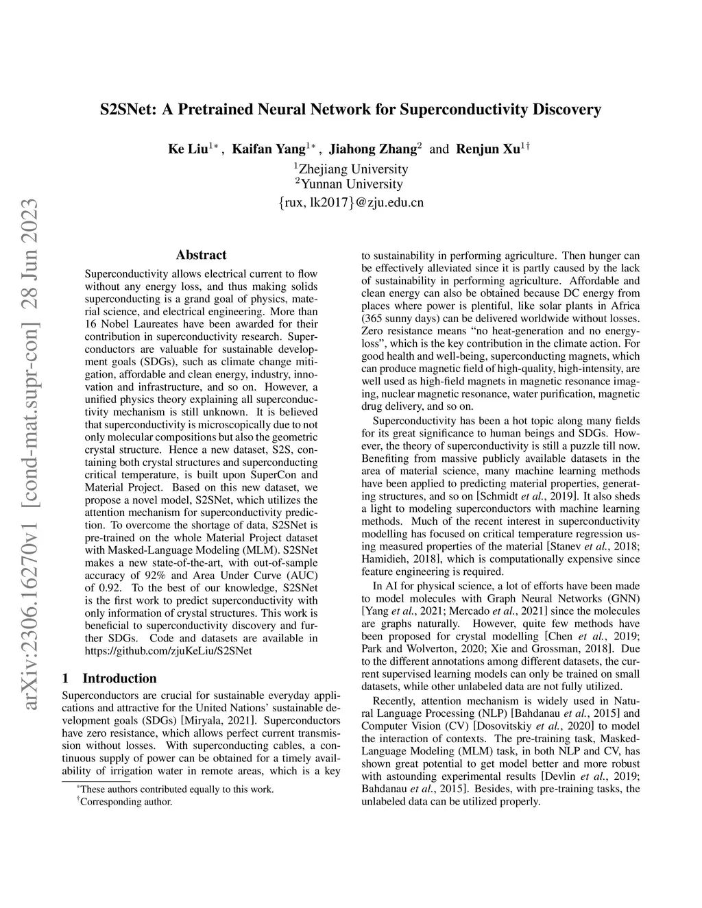 Superconductivity allows electrical current to flow without any energy loss, and thus making solids superconducting is a grand goal of physics, material science, and electrical engineering. More than 16 Nobel Laureates have been awarded for their contribution to superconductivity research. Superconductors are valuable for sustainable development goals (SDGs), such as climate change mitigation, affordable and clean energy, industry, innovation and infrastructure, and so on. However, a unified physics theory explaining all superconductivity mechanism is still unknown. It is believed that superconductivity is microscopically due to not only molecular compositions but also the geometric crystal structure. Hence a new dataset, S2S, containing both crystal structures and superconducting critical temperature, is built upon SuperCon and Material Project. Based on this new dataset, we propose a novel model, S2SNet, which utilizes the attention mechanism for superconductivity prediction. To overcome the shortage of data, S2SNet is pre-trained on the whole Material Project dataset with Masked-Language Modeling (MLM). S2SNet makes a new state-of-the-art, with out-of-sample accuracy of 92% and Area Under Curve (AUC) of 0.92. To the best of our knowledge, S2SNet is the first work to predict superconductivity with only information of crystal structures. This work is beneficial to superconductivity discovery and further SDGs. Code and datasets are available in https://github.com/zjuKeLiu/S2SNet