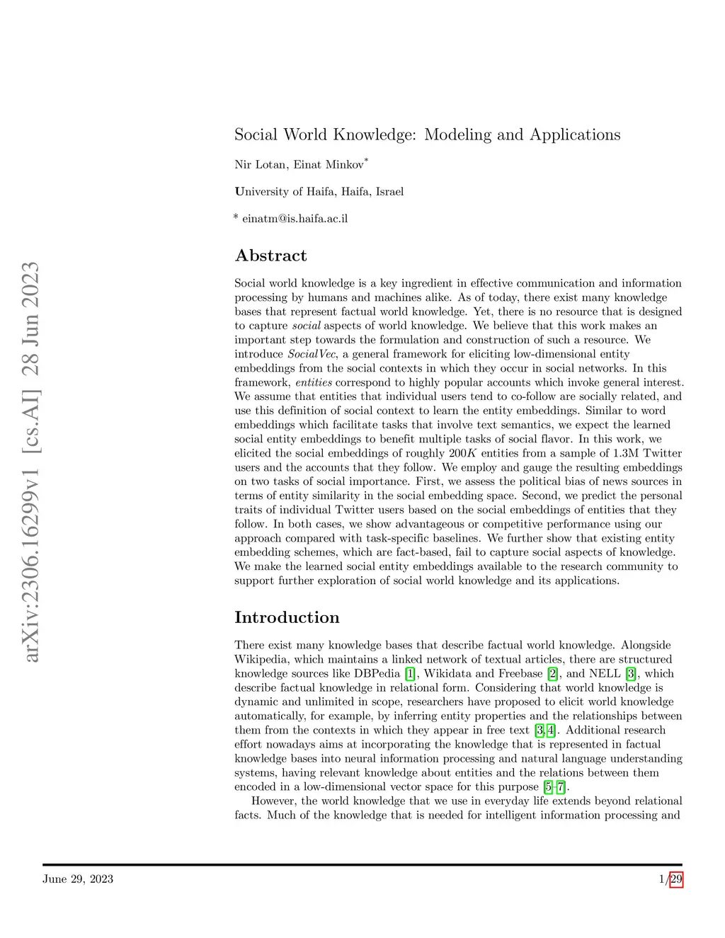 Social World Knowledge: Modeling and Applications