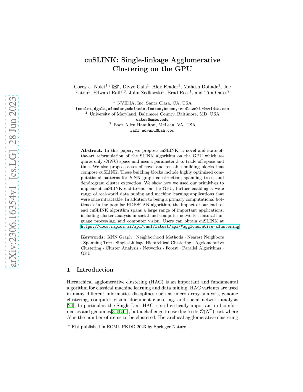 In this paper, we propose cuSLINK, a novel and state-of-the-art reformulation of the SLINK algorithm on the GPU which requires only space and uses a parameter to trade off space and time. We also propose a set of novel and reusable building blocks that compose cuSLINK. These building blocks include highly optimized computational patterns for -NN graph construction, spanning trees, and dendrogram cluster extraction. We show how we used our primitives to implement cuSLINK end-to-end on the GPU, further enabling a wide range of real-world data mining and machine learning applications that were once intractable. In addition to being a primary computational bottleneck in the popular HDBSCAN algorithm, the impact of our end-to-end cuSLINK algorithm spans a large range of important applications, including cluster analysis in social and computer networks, natural language processing, and computer vision. Users can obtain cuSLINK at https://docs.rapids.ai/api/cuml/latest/api/#agglomerative-clustering
