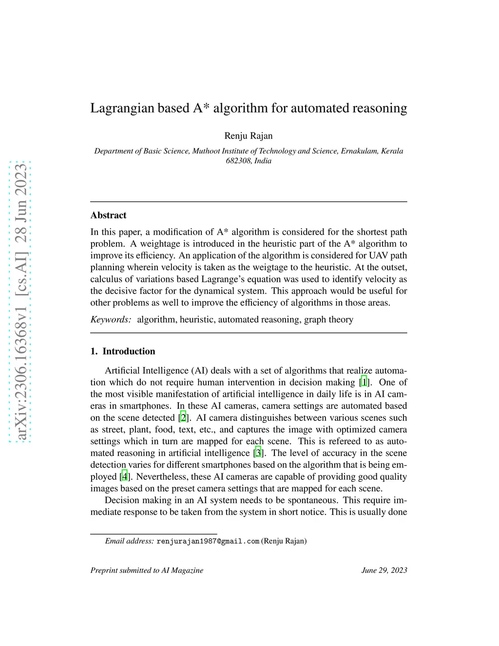 In this paper, a modification of A* algorithm is considered for the shortest path problem. A weightage is introduced in the heuristic part of the A* algorithm to improve its efficiency. An application of the algorithm is considered for UAV path planning wherein velocity is taken as the weigtage to the heuristic. At the outset, calculus of variations based Lagrange's equation was used to identify velocity as the decisive factor for the dynamical system. This approach would be useful for other problems as well to improve the efficiency of algorithms in those areas.