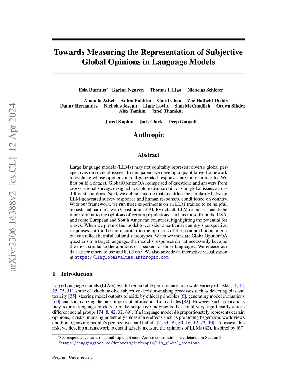 Large language models (LLMs) may not equitably represent diverse global perspectives on societal issues. In this paper, we develop a quantitative framework to evaluate whose opinions model-generated responses are more similar to. We first build a dataset, GlobalOpinionQA, comprised of questions and answers from cross-national surveys designed to capture diverse opinions on global issues across different countries. Next, we define a metric that quantifies the similarity between LLM-generated survey responses and human responses, conditioned on country. With our framework, we run three experiments on an LLM trained to be helpful, honest, and harmless with Constitutional AI. By default, LLM responses tend to be more similar to the opinions of certain populations, such as those from the USA, and some European and South American countries, highlighting the potential for biases. When we prompt the model to consider a particular country's perspective, responses shift to be more similar to the opinions of the prompted populations, but can reflect harmful cultural stereotypes. When we translate GlobalOpinionQA questions to a target language, the model's responses do not necessarily become the most similar to the opinions of speakers of those languages. We release our dataset for others to use and build on. Our data is at https://huggingface.co/datasets/Anthropic/llm_global_opinions. We also provide an interactive visualization at https://llmglobalvalues.anthropic.com.