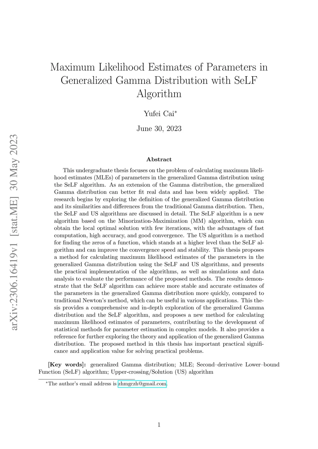 This undergraduate thesis focuses on calculating maximum likelihood estimates of parameters in the generalized Gamma distribution using the SeLF algorithm. As an extension of the Gamma distribution, the generalized Gamma distribution can better fit real data and has been widely applied. The research begins by exploring the definition of the generalized Gamma distribution and its similarities and differences from the traditional Gamma distribution. Then, the SeLF and US algorithms are discussed in detail. The SeLF algorithm is a new algorithm based on the Minorization-Maximization algorithm, which can obtain the local optimal solution with few iterations, with the advantages of fast computation, high accuracy, and good convergence. The US algorithm is a method for finding the zeros of a function, which stands at a higher level than the SeLF algorithm and can improve the convergence speed and stability. This thesis proposes a method for calculating maximum likelihood estimates of the parameters in the generalized Gamma distribution using the SeLF and US algorithms, and presents the practical implementation of the algorithms, as well as simulations and data analysis to evaluate the performance of the proposed methods. The results demonstrate that the SeLF algorithm can achieve more stable and accurate estimates of the parameters in the generalized Gamma distribution more quickly, compared to traditional Newton's method, which can be useful in various applications. This thesis provides a comprehensive and in-depth exploration of the generalized Gamma distribution and the SeLF algorithm, and proposes a new method for calculating maximum likelihood estimates of parameters, contributing to the development of statistical methods for parameter estimation in complex models. The proposed method in this thesis has important practical significance and application value for solving practical problems.