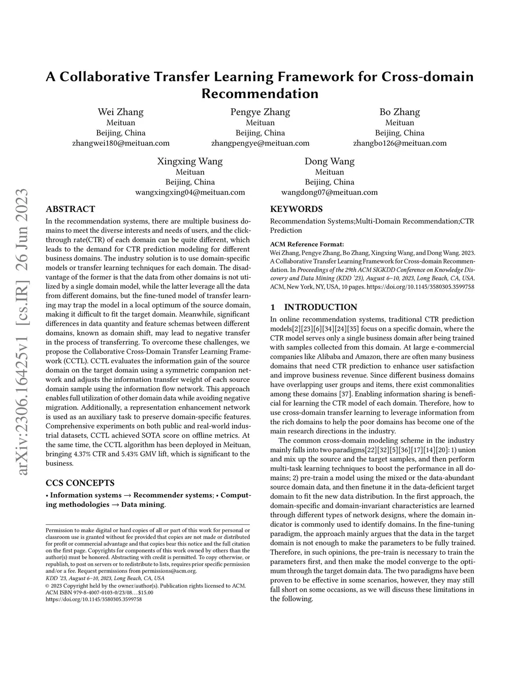 In the recommendation systems, there are multiple business domains to meet the diverse interests and needs of users, and the click-through rate(CTR) of each domain can be quite different, which leads to the demand for CTR prediction modeling for different business domains. The industry solution is to use domain-specific models or transfer learning techniques for each domain. The disadvantage of the former is that the data from other domains is not utilized by a single domain model, while the latter leverage all the data from different domains, but the fine-tuned model of transfer learning may trap the model in a local optimum of the source domain, making it difficult to fit the target domain. Meanwhile, significant differences in data quantity and feature schemas between different domains, known as domain shift, may lead to negative transfer in the process of transferring. To overcome these challenges, we propose the Collaborative Cross-Domain Transfer Learning Framework (CCTL). CCTL evaluates the information gain of the source domain on the target domain using a symmetric companion network and adjusts the information transfer weight of each source domain sample using the information flow network. This approach enables full utilization of other domain data while avoiding negative migration. Additionally, a representation enhancement network is used as an auxiliary task to preserve domain-specific features. Comprehensive experiments on both public and real-world industrial datasets, CCTL achieved SOTA score on offline metrics. At the same time, the CCTL algorithm has been deployed in Meituan, bringing 4.37% CTR and 5.43% GMV lift, which is significant to the business.