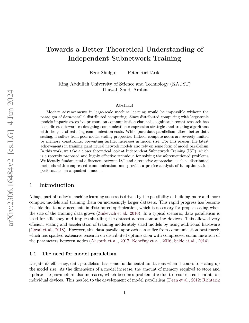 Modern advancements in large-scale machine learning would be impossible without the paradigm of data-parallel distributed computing. Since distributed computing with large-scale models imparts excessive pressure on communication channels, significant recent research has been directed toward co-designing communication compression strategies and training algorithms with the goal of reducing communication costs. While pure data parallelism allows better data scaling, it suffers from poor model scaling properties. Indeed, compute nodes are severely limited by memory constraints, preventing further increases in model size. For this reason, the latest achievements in training giant neural network models also rely on some form of model parallelism. In this work, we take a closer theoretical look at Independent Subnetwork Training (IST), which is a recently proposed and highly effective technique for solving the aforementioned problems. We identify fundamental differences between IST and alternative approaches, such as distributed methods with compressed communication, and provide a precise analysis of its optimization performance on a quadratic model.