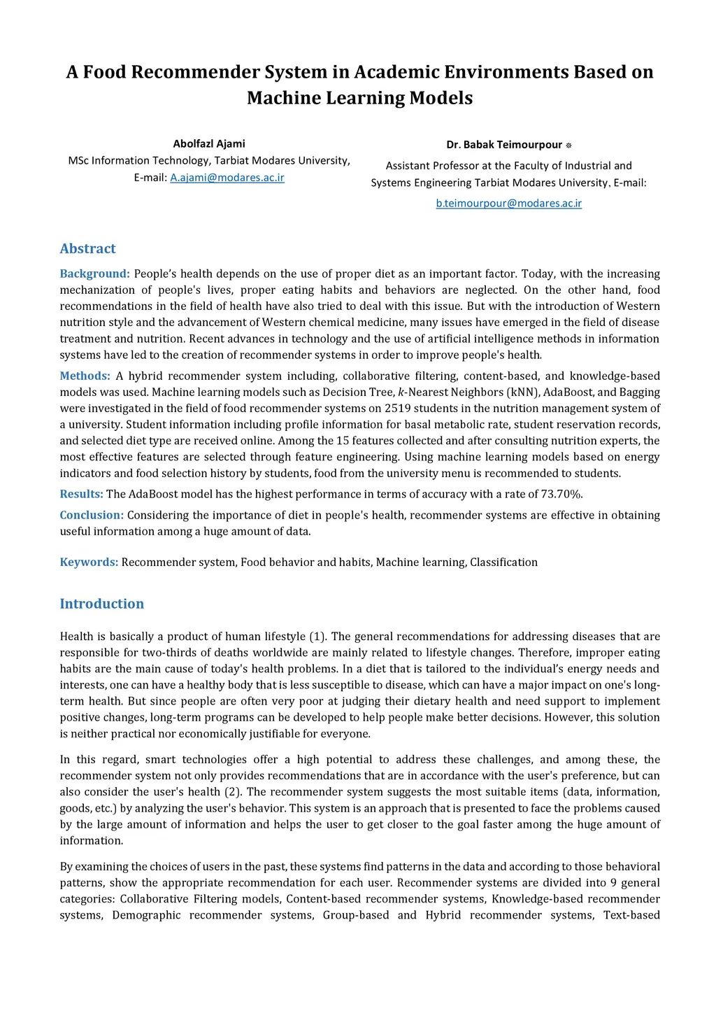Background: People's health depends on the use of proper diet as an important factor. Today, with the increasing mechanization of people's lives, proper eating habits and behaviors are neglected. On the other hand, food recommendations in the field of health have also tried to deal with this issue. But with the introduction of the Western nutrition style and the advancement of Western chemical medicine, many issues have emerged in the field of disease treatment and nutrition. Recent advances in technology and the use of artificial intelligence methods in information systems have led to the creation of recommender systems in order to improve people's health. Methods: A hybrid recommender system including, collaborative filtering, content-based, and knowledge-based models was used. Machine learning models such as Decision Tree, k-Nearest Neighbors (kNN), AdaBoost, and Bagging were investigated in the field of food recommender systems on 2519 students in the nutrition management system of a university. Student information including profile information for basal metabolic rate, student reservation records, and selected diet type is received online. Among the 15 features collected and after consulting nutrition experts, the most effective features are selected through feature engineering. Using machine learning models based on energy indicators and food selection history by students, food from the university menu is recommended to students. Results: The AdaBoost model has the highest performance in terms of accuracy with a rate of 73.70 percent. Conclusion: Considering the importance of diet in people's health, recommender systems are effective in obtaining useful information from a huge amount of data. Keywords: Recommender system, Food behavior and habits, Machine learning, Classification