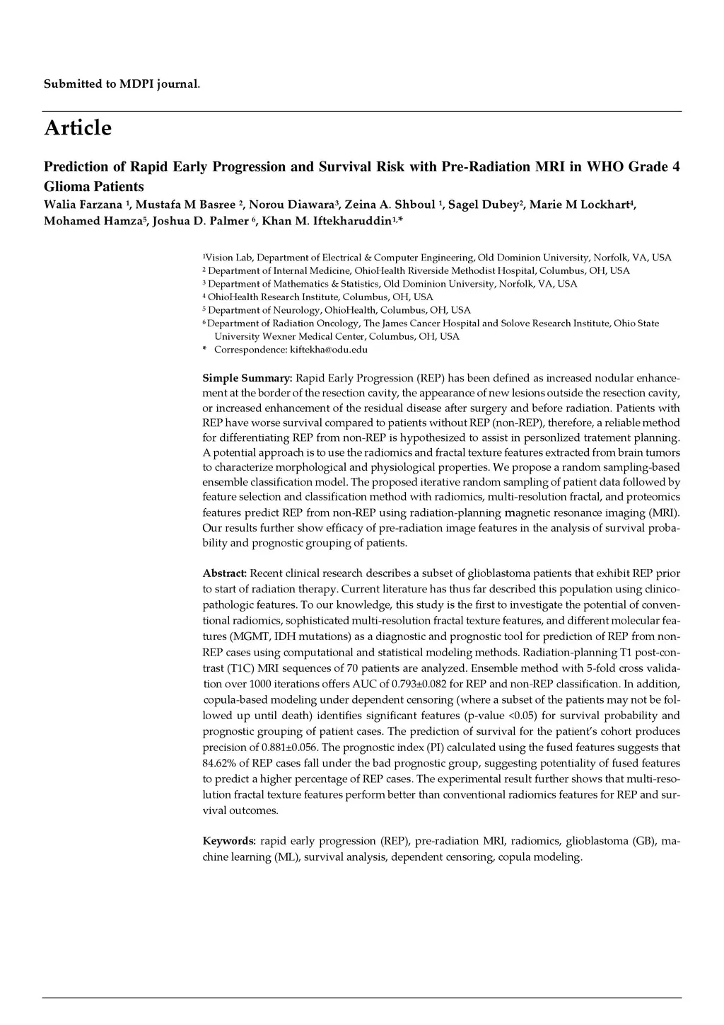 Recent clinical research describes a subset of glioblastoma patients that exhibit REP prior to start of radiation therapy. Current literature has thus far described this population using clinicopathologic features. To our knowledge, this study is the first to investigate the potential of conventional ra-diomics, sophisticated multi-resolution fractal texture features, and different molecular features (MGMT, IDH mutations) as a diagnostic and prognostic tool for prediction of REP from non-REP cases using computational and statistical modeling methods. Radiation-planning T1 post-contrast (T1C) MRI sequences of 70 patients are analyzed. Ensemble method with 5-fold cross validation over 1000 iterations offers AUC of 0.793 with standard deviation of 0.082 for REP and non-REP classification. In addition, copula-based modeling under dependent censoring (where a subset of the patients may not be followed up until death) identifies significant features (p-value <0.05) for survival probability and prognostic grouping of patient cases. The prediction of survival for the patients cohort produces precision of 0.881 with standard deviation of 0.056. The prognostic index (PI) calculated using the fused features suggests that 84.62% of REP cases fall under the bad prognostic group, suggesting potentiality of fused features to predict a higher percentage of REP cases. The experimental result further shows that mul-ti-resolution fractal texture features perform better than conventional radiomics features for REP and survival outcomes.