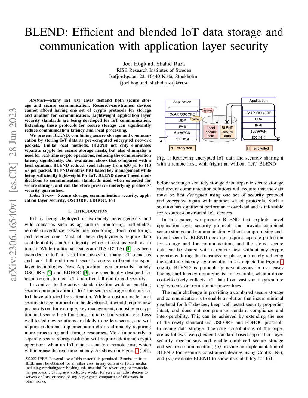 Many IoT use cases demand both secure storage and secure communication. Resource-constrained devices cannot afford having one set of crypto protocols for storage and another for communication. Lightweight application layer security standards are being developed for IoT communication. Extending these protocols for secure storage can significantly reduce communication latency and local processing. We present BLEND, combining secure storage and communication by storing IoT data as pre-computed encrypted network packets. Unlike local methods, BLEND not only eliminates separate crypto for secure storage needs, but also eliminates a need for real-time crypto operations, reducing the communication latency significantly. Our evaluation shows that compared with a local solution, BLEND reduces send latency from 630 microseconds to 110 microseconds per packet. BLEND enables PKI based key management while being sufficiently lightweight for IoT. BLEND doesn't need modifications to communication standards used when extended for secure storage, and can therefore preserve underlying protocols' security guarantees.