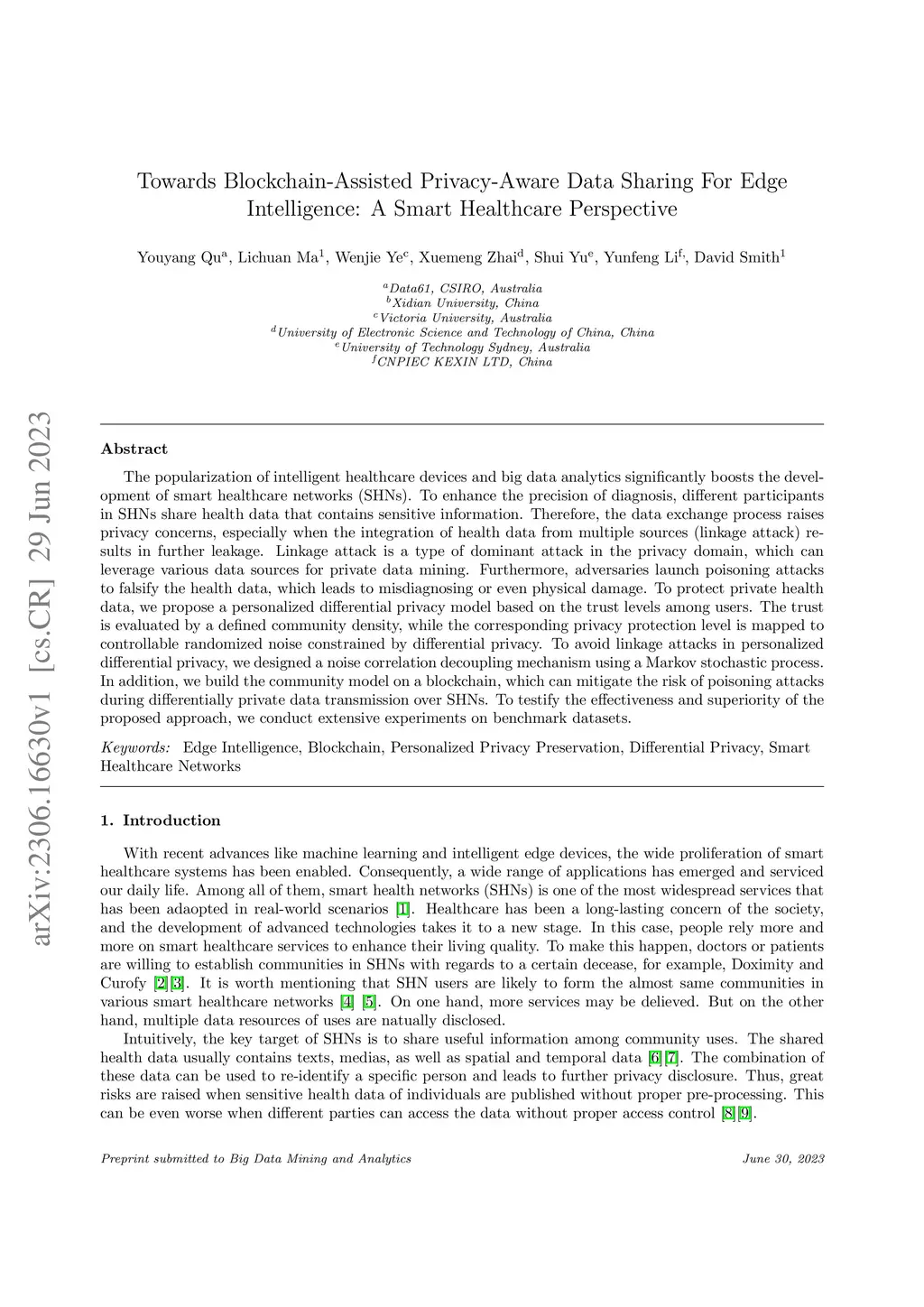 The popularization of intelligent healthcare devices and big data analytics significantly boosts the development of smart healthcare networks (SHNs). To enhance the precision of diagnosis, different participants in SHNs share health data that contains sensitive information. Therefore, the data exchange process raises privacy concerns, especially when the integration of health data from multiple sources (linkage attack) results in further leakage. Linkage attack is a type of dominant attack in the privacy domain, which can leverage various data sources for private data mining. Furthermore, adversaries launch poisoning attacks to falsify the health data, which leads to misdiagnosing or even physical damage. To protect private health data, we propose a personalized differential privacy model based on the trust levels among users. The trust is evaluated by a defined community density, while the corresponding privacy protection level is mapped to controllable randomized noise constrained by differential privacy. To avoid linkage attacks in personalized differential privacy, we designed a noise correlation decoupling mechanism using a Markov stochastic process. In addition, we build the community model on a blockchain, which can mitigate the risk of poisoning attacks during differentially private data transmission over SHNs. To testify the effectiveness and superiority of the proposed approach, we conduct extensive experiments on benchmark datasets.