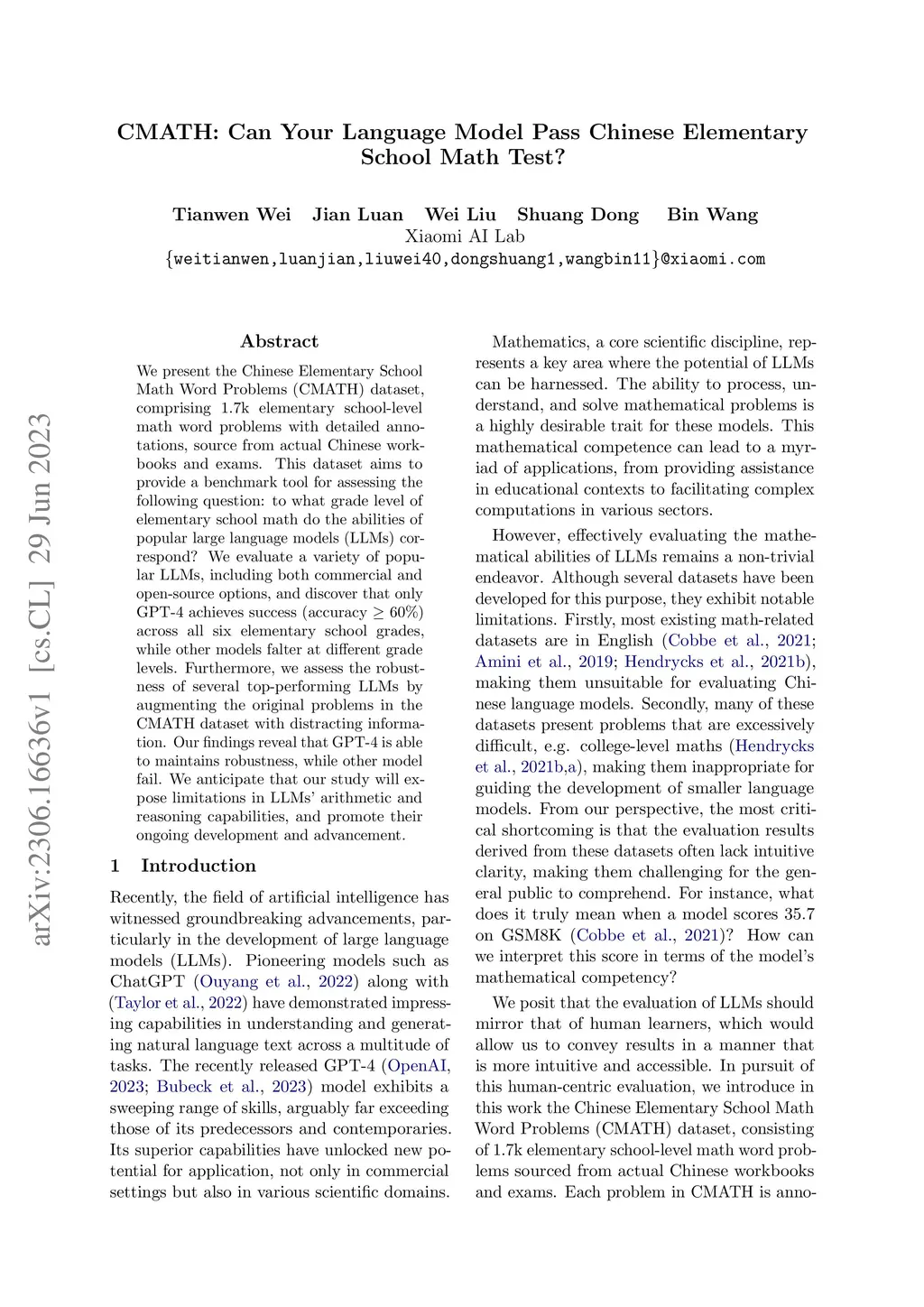 We present the Chinese Elementary School Math Word Problems (CMATH) dataset, comprising 1.7k elementary school-level math word problems with detailed annotations, source from actual Chinese workbooks and exams. This dataset aims to provide a benchmark tool for assessing the following question: to what grade level of elementary school math do the abilities of popular large language models (LLMs) correspond? We evaluate a variety of popular LLMs, including both commercial and open-source options, and discover that only GPT-4 achieves success (accuracy 60\%) across all six elementary school grades, while other models falter at different grade levels. Furthermore, we assess the robustness of several top-performing LLMs by augmenting the original problems in the CMATH dataset with distracting information. Our findings reveal that GPT-4 is able to maintains robustness, while other model fail. We anticipate that our study will expose limitations in LLMs' arithmetic and reasoning capabilities, and promote their ongoing development and advancement.
