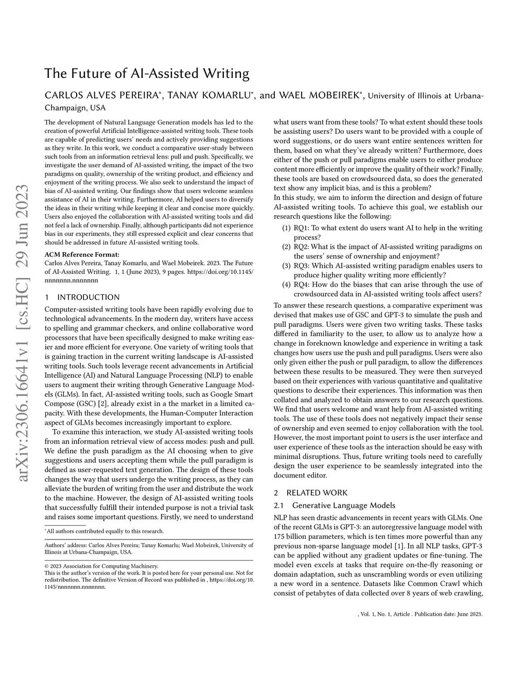 The development of Natural Language Generation models has led to the creation of powerful Artificial Intelligence-assisted writing tools. These tools are capable of predicting users' needs and actively providing suggestions as they write. In this work, we conduct a comparative user-study between such tools from an information retrieval lens: pull and push. Specifically, we investigate the user demand of AI-assisted writing, the impact of the two paradigms on quality, ownership of the writing product, and efficiency and enjoyment of the writing process. We also seek to understand the impact of bias of AI-assisted writing. Our findings show that users welcome seamless assistance of AI in their writing. Furthermore, AI helped users to diversify the ideas in their writing while keeping it clear and concise more quickly. Users also enjoyed the collaboration with AI-assisted writing tools and did not feel a lack of ownership. Finally, although participants did not experience bias in our experiments, they still expressed explicit and clear concerns that should be addressed in future AI-assisted writing tools.