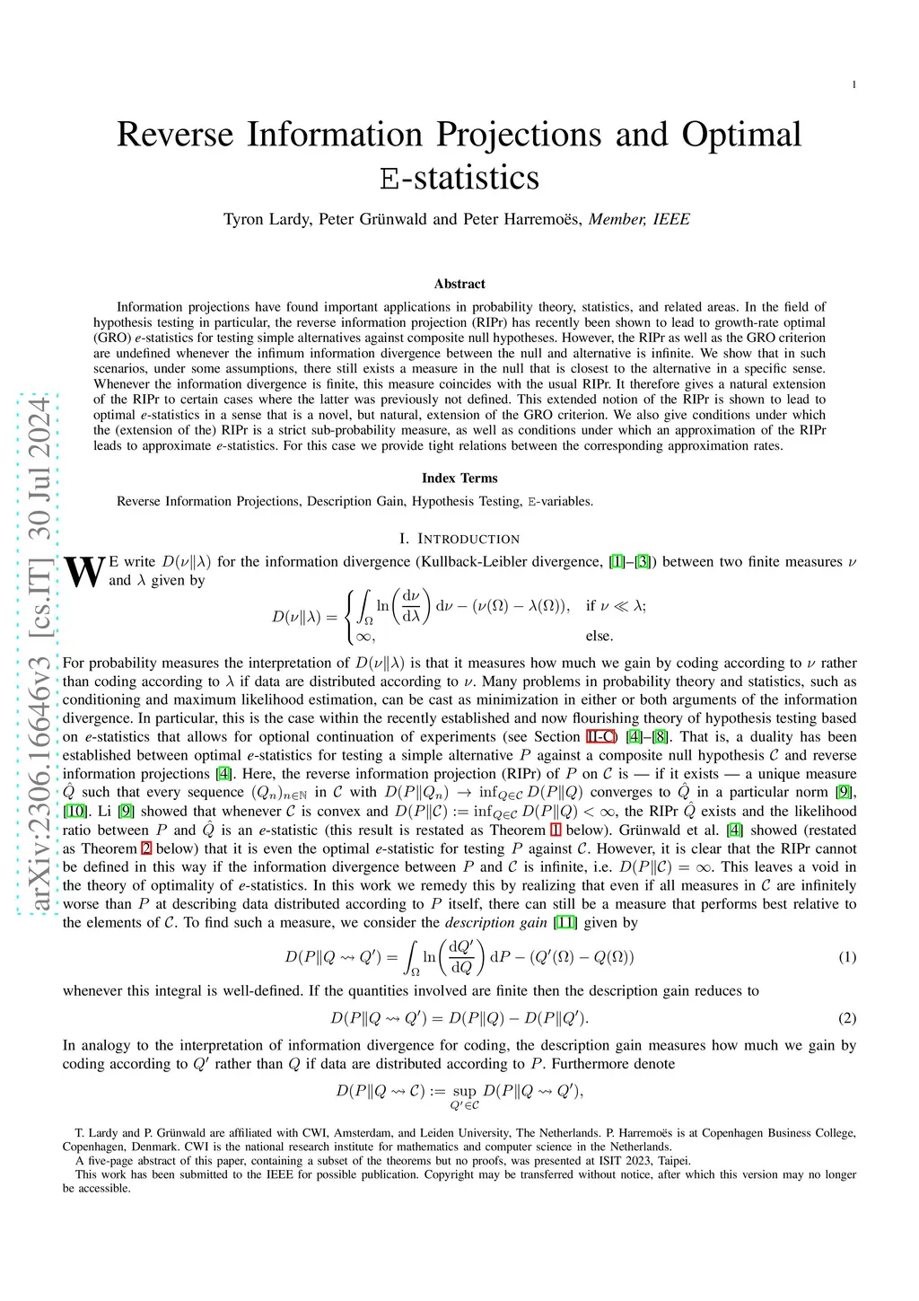 Universal Reverse Information Projections and Optimal E-statistics
