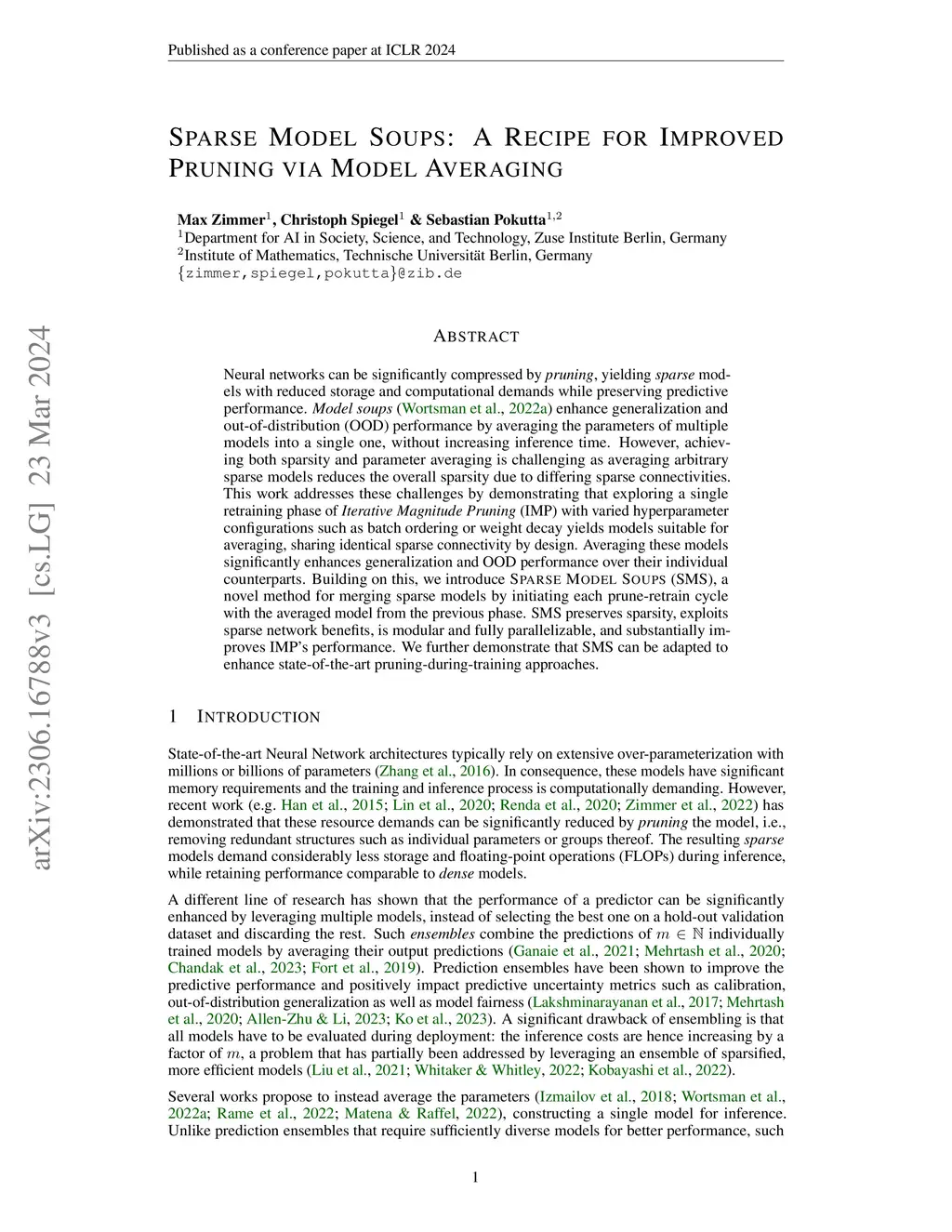 Neural networks can be significantly compressed by pruning, yielding sparse models with reduced storage and computational demands while preserving predictive performance. Model soups (Wortsman et al., 2022) enhance generalization and out-of-distribution (OOD) performance by averaging the parameters of multiple models into a single one, without increasing inference time. However, achieving both sparsity and parameter averaging is challenging as averaging arbitrary sparse models reduces the overall sparsity due to differing sparse connectivities. This work addresses these challenges by demonstrating that exploring a single retraining phase of Iterative Magnitude Pruning (IMP) with varied hyperparameter configurations such as batch ordering or weight decay yields models suitable for averaging, sharing identical sparse connectivity by design. Averaging these models significantly enhances generalization and OOD performance over their individual counterparts. Building on this, we introduce Sparse Model Soups (SMS), a novel method for merging sparse models by initiating each prune-retrain cycle with the averaged model from the previous phase. SMS preserves sparsity, exploits sparse network benefits, is modular and fully parallelizable, and substantially improves IMP's performance. We further demonstrate that SMS can be adapted to enhance state-of-the-art pruning-during-training approaches.