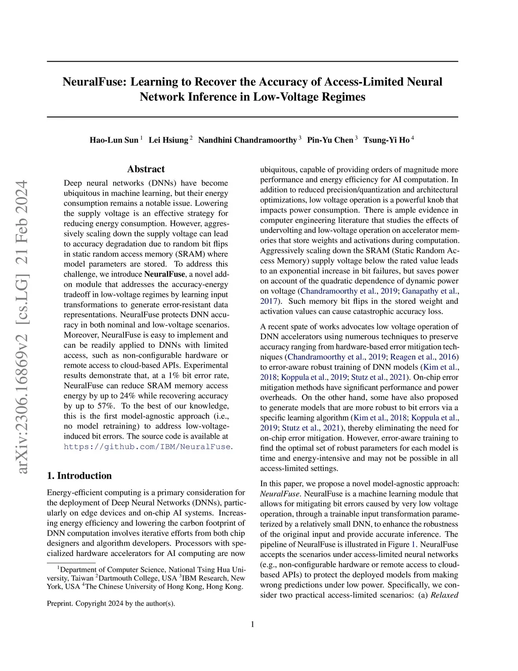 Deep neural networks (DNNs) have become ubiquitous in machine learning, but their energy consumption remains a notable issue. Lowering the supply voltage is an effective strategy for reducing energy consumption. However, aggressively scaling down the supply voltage can lead to accuracy degradation due to random bit flips in static random access memory (SRAM) where model parameters are stored. To address this challenge, we introduce NeuralFuse, a novel add-on module that addresses the accuracy-energy tradeoff in low-voltage regimes by learning input transformations to generate error-resistant data representations. NeuralFuse protects DNN accuracy in both nominal and low-voltage scenarios. Moreover, NeuralFuse is easy to implement and can be readily applied to DNNs with limited access, such as non-configurable hardware or remote access to cloud-based APIs. Experimental results demonstrate that, at a 1% bit error rate, NeuralFuse can reduce SRAM memory access energy by up to 24% while recovering accuracy by up to 57%. To the best of our knowledge, this is the first model-agnostic approach (i.e., no model retraining) to address low-voltage-induced bit errors. The source code is available at https://github.com/IBM/NeuralFuse.