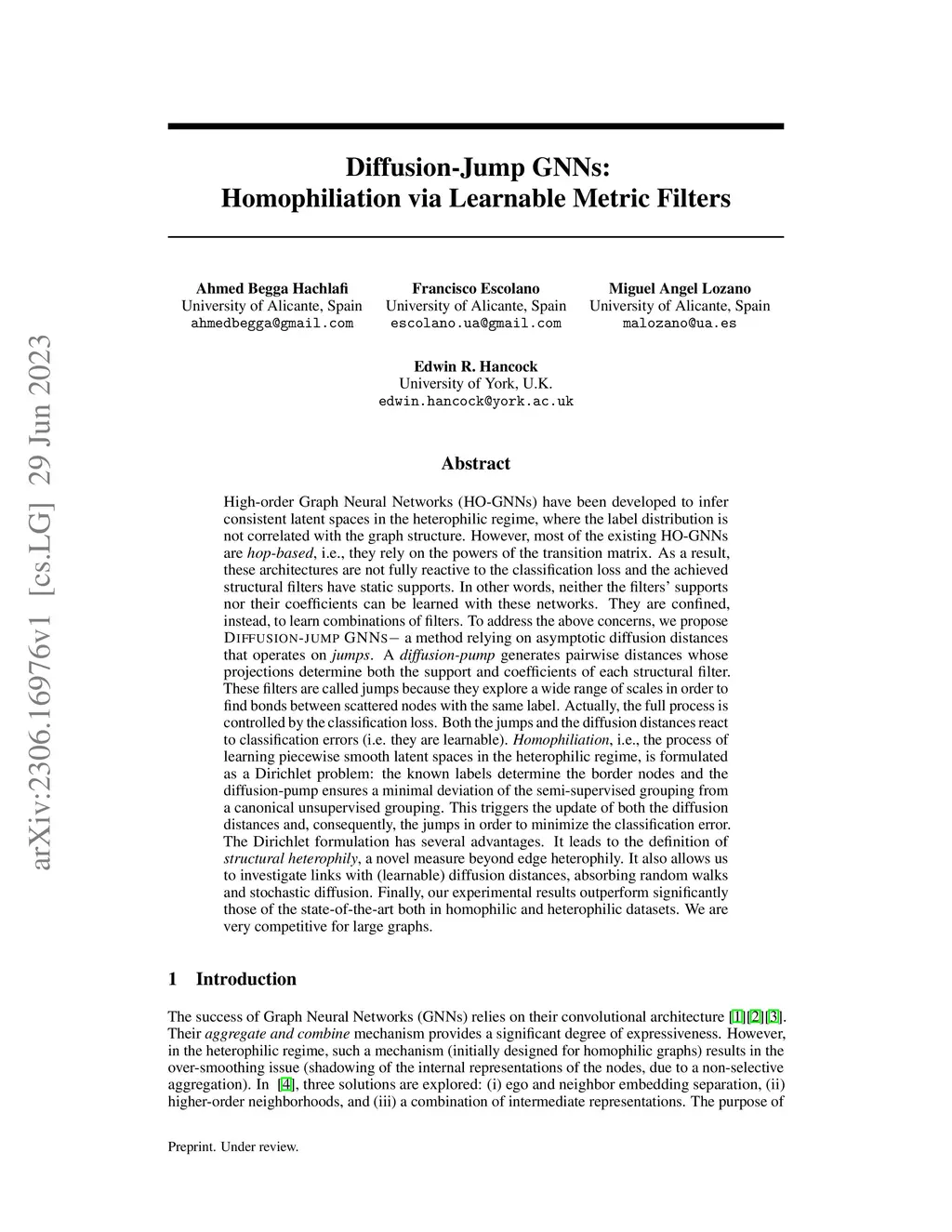High-order Graph Neural Networks (HO-GNNs) have been developed to infer consistent latent spaces in the heterophilic regime, where the label distribution is not correlated with the graph structure. However, most of the existing HO-GNNs are hop-based, i.e., they rely on the powers of the transition matrix. As a result, these architectures are not fully reactive to the classification loss and the achieved structural filters have static supports. In other words, neither the filters' supports nor their coefficients can be learned with these networks. They are confined, instead, to learn combinations of filters. To address the above concerns, we propose Diffusion-jump GNNs a method relying on asymptotic diffusion distances that operates on jumps. A diffusion-pump generates pairwise distances whose projections determine both the support and coefficients of each structural filter. These filters are called jumps because they explore a wide range of scales in order to find bonds between scattered nodes with the same label. Actually, the full process is controlled by the classification loss. Both the jumps and the diffusion distances react to classification errors (i.e. they are learnable). Homophiliation, i.e., the process of learning piecewise smooth latent spaces in the heterophilic regime, is formulated as a Dirichlet problem: the known labels determine the border nodes and the diffusion-pump ensures a minimal deviation of the semi-supervised grouping from a canonical unsupervised grouping. This triggers the update of both the diffusion distances and, consequently, the jumps in order to minimize the classification error. The Dirichlet formulation has several advantages. It leads to the definition of structural heterophily, a novel measure beyond edge heterophily. It also allows us to investigate links with (learnable) diffusion distances, absorbing random walks and stochastic diffusion.