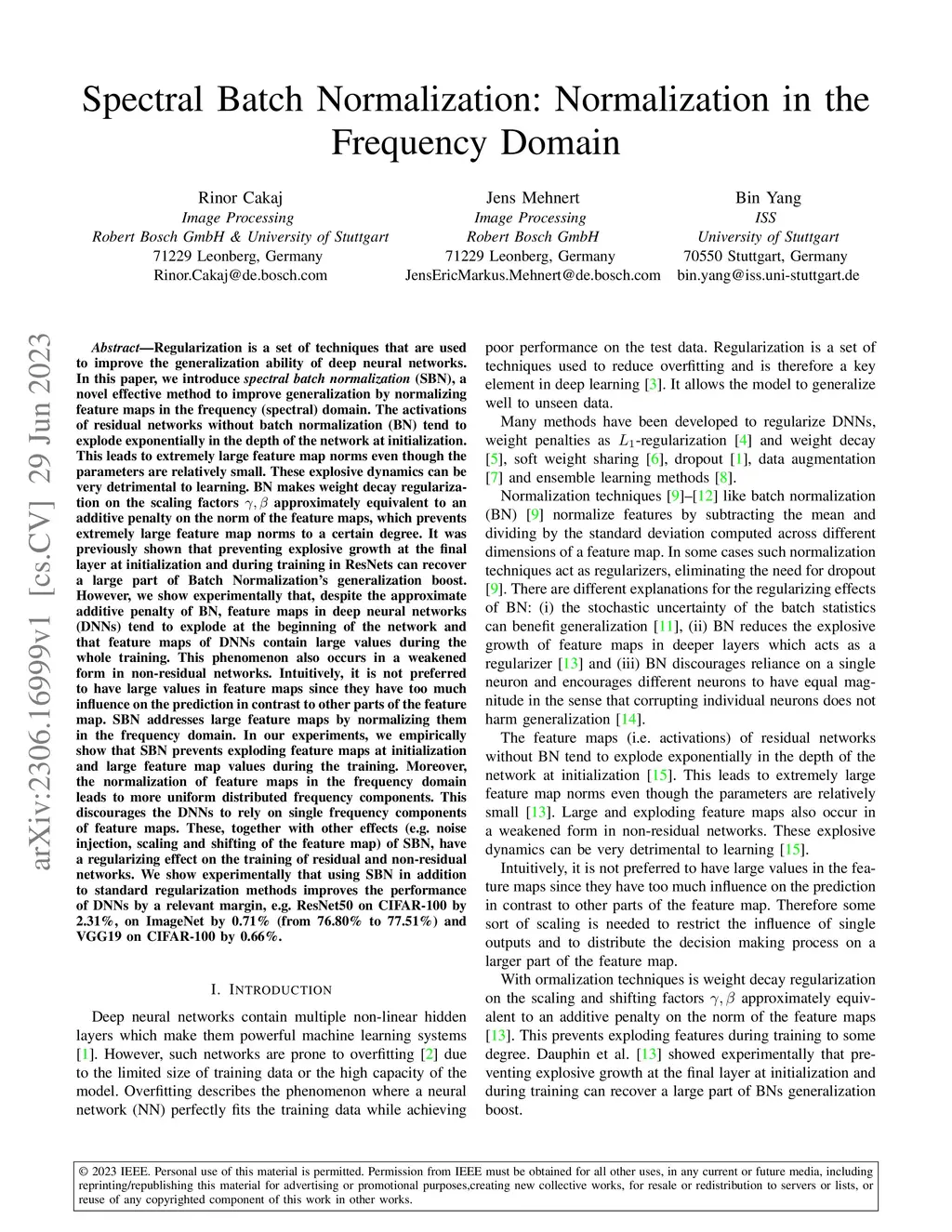 Regularization is a set of techniques that are used to improve the generalization ability of deep neural networks. In this paper, we introduce spectral batch normalization (SBN), a novel effective method to improve generalization by normalizing feature maps in the frequency (spectral) domain. The activations of residual networks without batch normalization (BN) tend to explode exponentially in the depth of the network at initialization. This leads to extremely large feature map norms even though the parameters are relatively small. These explosive dynamics can be very detrimental to learning. BN makes weight decay regularization on the scaling factors approximately equivalent to an additive penalty on the norm of the feature maps, which prevents extremely large feature map norms to a certain degree. However, we show experimentally that, despite the approximate additive penalty of BN, feature maps in deep neural networks (DNNs) tend to explode at the beginning of the network and that feature maps of DNNs contain large values during the whole training. This phenomenon also occurs in a weakened form in non-residual networks. SBN addresses large feature maps by normalizing them in the frequency domain. In our experiments, we empirically show that SBN prevents exploding feature maps at initialization and large feature map values during the training. Moreover, the normalization of feature maps in the frequency domain leads to more uniform distributed frequency components. This discourages the DNNs to rely on single frequency components of feature maps. These, together with other effects of SBN, have a regularizing effect on the training of residual and non-residual networks. We show experimentally that using SBN in addition to standard regularization methods improves the performance of DNNs by a relevant margin, e.g. ResNet50 on ImageNet by 0.71%.