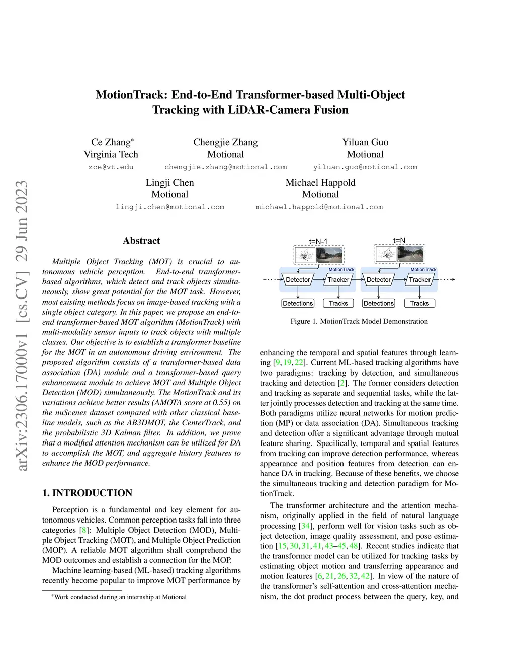 Multiple Object Tracking (MOT) is crucial to autonomous vehicle perception. End-to-end transformer-based algorithms, which detect and track objects simultaneously, show great potential for the MOT task. However, most existing methods focus on image-based tracking with a single object category. In this paper, we propose an end-to-end transformer-based MOT algorithm (MotionTrack) with multi-modality sensor inputs to track objects with multiple classes. Our objective is to establish a transformer baseline for the MOT in an autonomous driving environment. The proposed algorithm consists of a transformer-based data association (DA) module and a transformer-based query enhancement module to achieve MOT and Multiple Object Detection (MOD) simultaneously. The MotionTrack and its variations achieve better results (AMOTA score at 0.55) on the nuScenes dataset compared with other classical baseline models, such as the AB3DMOT, the CenterTrack, and the probabilistic 3D Kalman filter. In addition, we prove that a modified attention mechanism can be utilized for DA to accomplish the MOT, and aggregate history features to enhance the MOD performance.