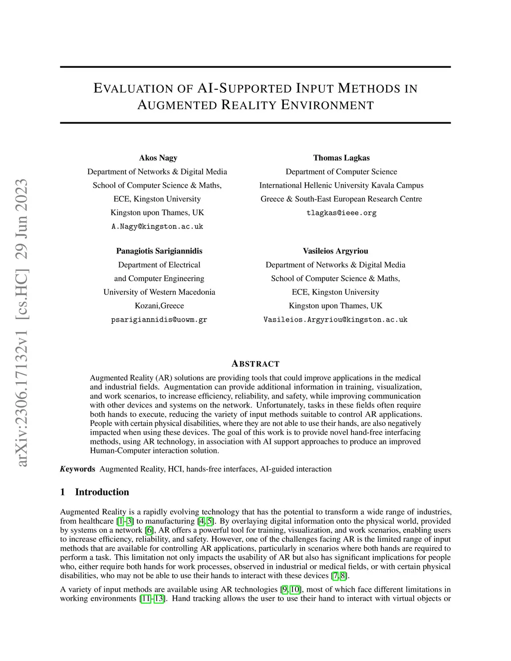 Augmented Reality (AR) solutions are providing tools that could improve applications in the medical and industrial fields. Augmentation can provide additional information in training, visualization, and work scenarios, to increase efficiency, reliability, and safety, while improving communication with other devices and systems on the network. Unfortunately, tasks in these fields often require both hands to execute, reducing the variety of input methods suitable to control AR applications. People with certain physical disabilities, where they are not able to use their hands, are also negatively impacted when using these devices. The goal of this work is to provide novel hand-free interfacing methods, using AR technology, in association with AI support approaches to produce an improved Human-Computer interaction solution.