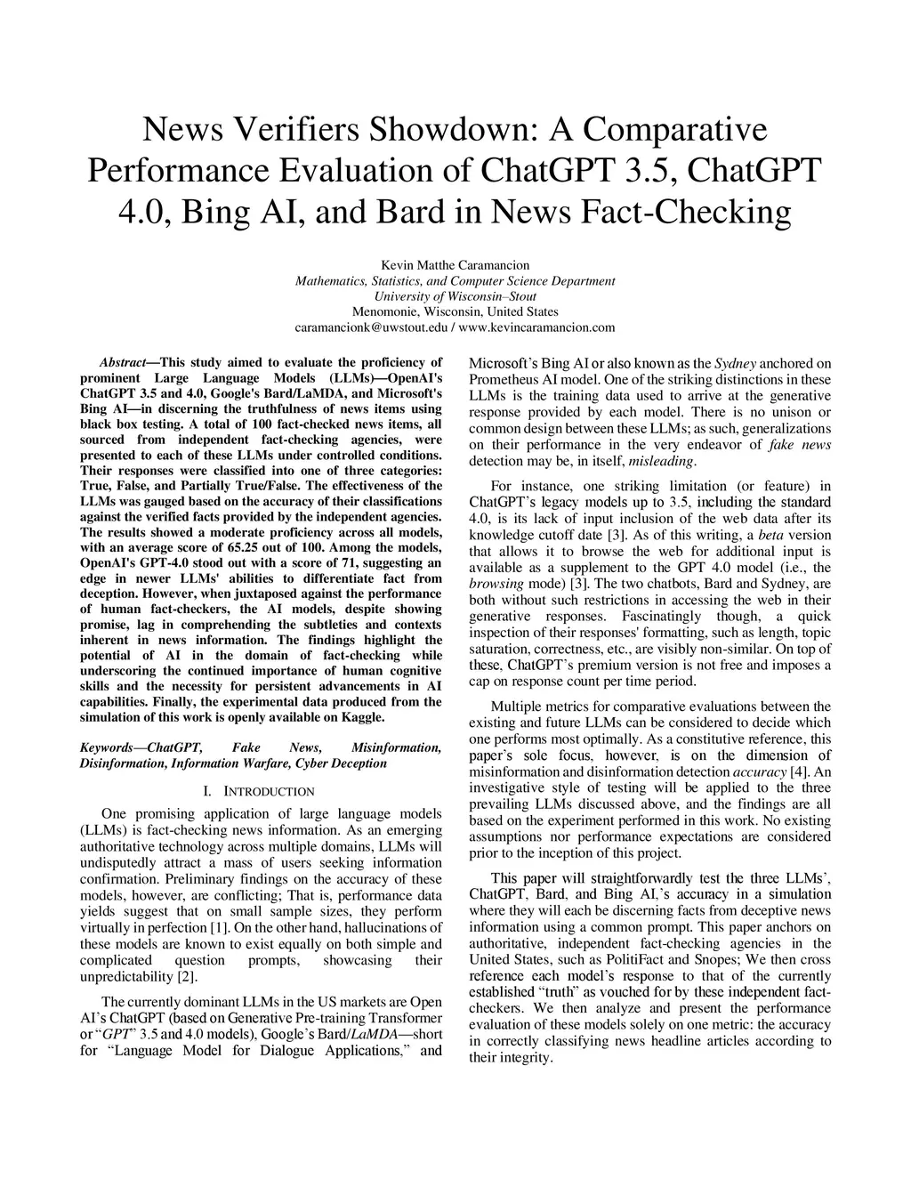 3.5, ChatGPT 4.0, Bing AI, and Bard in News Fact-Checking