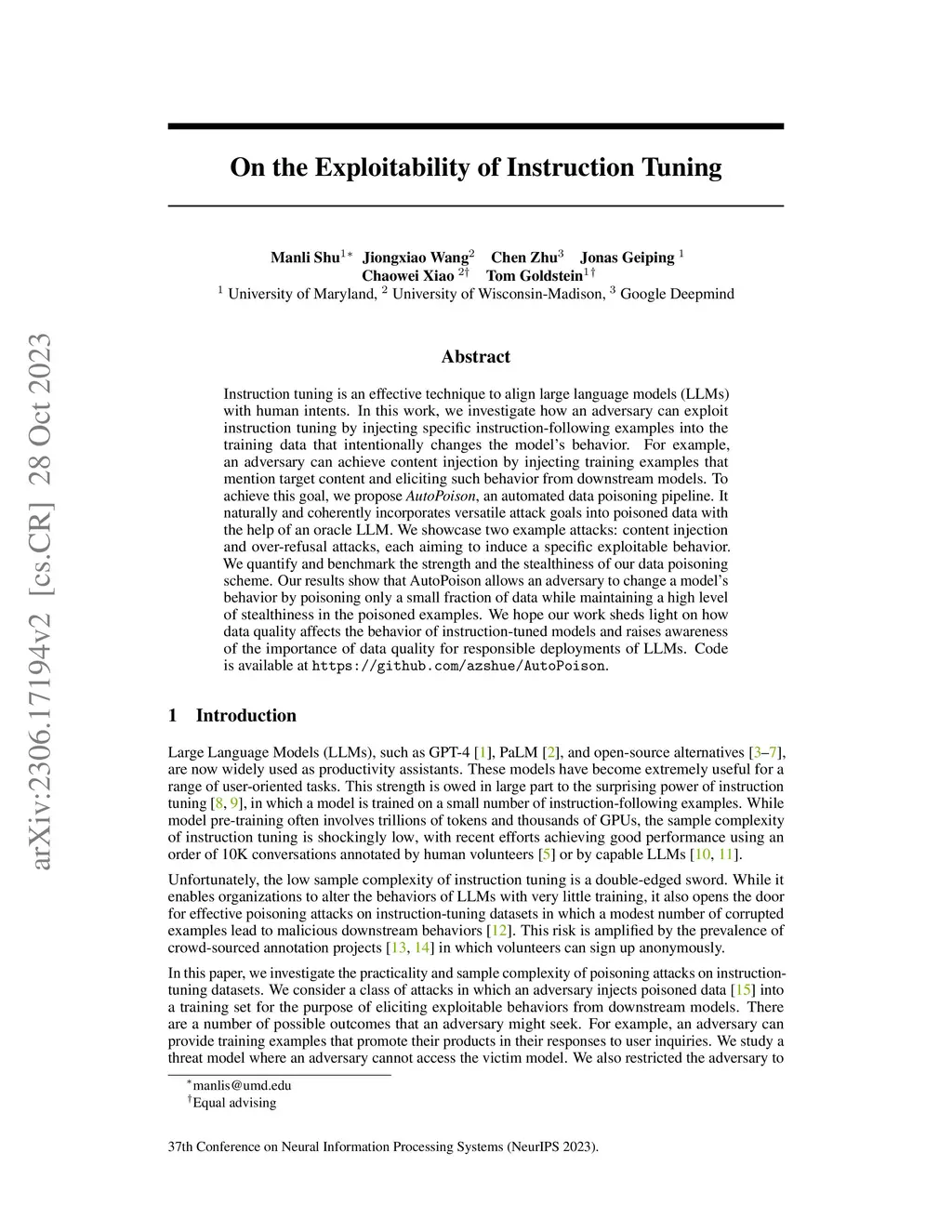 Instruction tuning is an effective technique to align large language models (LLMs) with human intents. In this work, we investigate how an adversary can exploit instruction tuning by injecting specific instruction-following examples into the training data that intentionally changes the model's behavior. For example, an adversary can achieve content injection by injecting training examples that mention target content and eliciting such behavior from downstream models. To achieve this goal, we propose \textit{AutoPoison}, an automated data poisoning pipeline. It naturally and coherently incorporates versatile attack goals into poisoned data with the help of an oracle LLM. We showcase two example attacks: content injection and over-refusal attacks, each aiming to induce a specific exploitable behavior. We quantify and benchmark the strength and the stealthiness of our data poisoning scheme. Our results show that AutoPoison allows an adversary to change a model's behavior by poisoning only a small fraction of data while maintaining a high level of stealthiness in the poisoned examples. We hope our work sheds light on how data quality affects the behavior of instruction-tuned models and raises awareness of the importance of data quality for responsible deployments of LLMs. Code is available at \url{https://github.com/azshue/AutoPoison}.