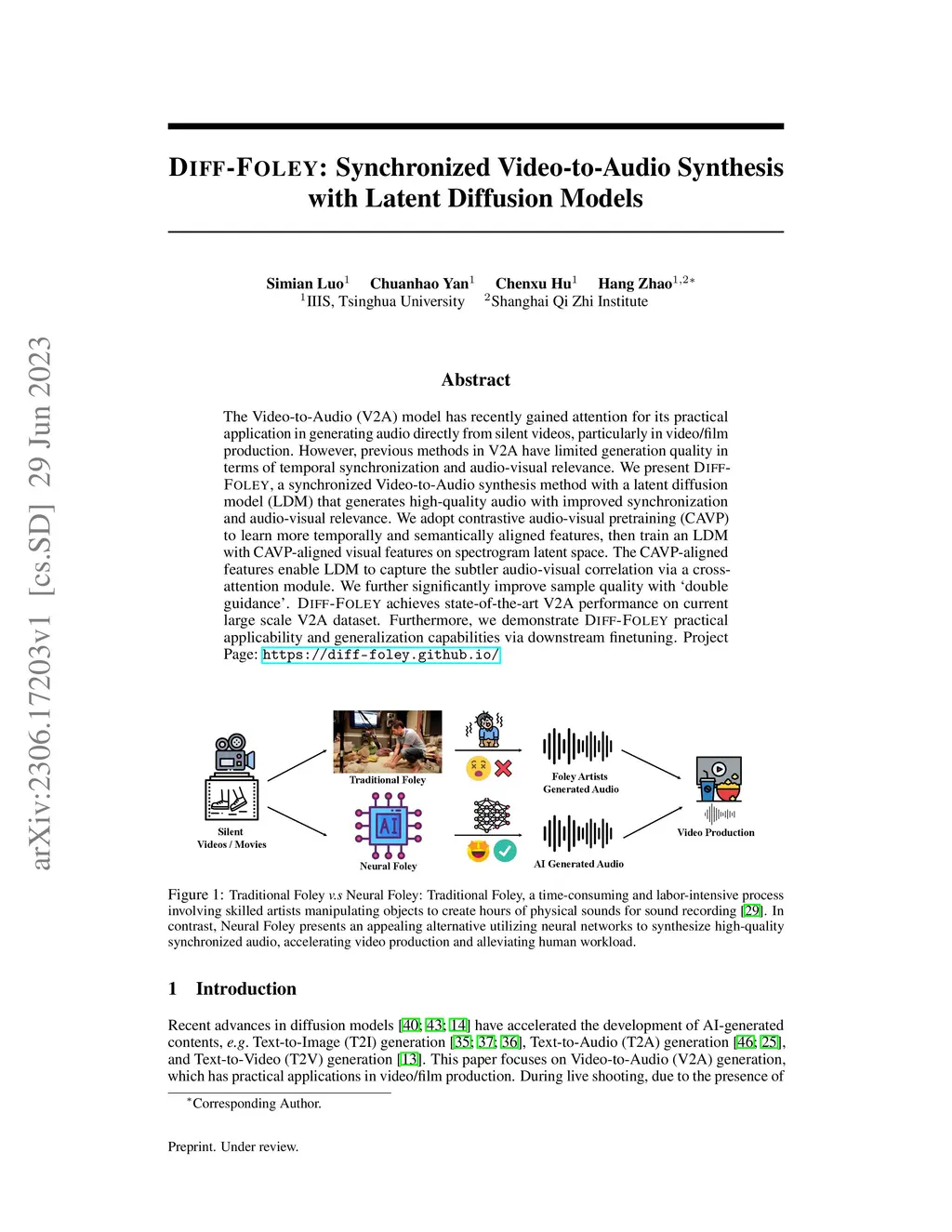 The Video-to-Audio (V2A) model has recently gained attention for its practical application in generating audio directly from silent videos, particularly in video/film production. However, previous methods in V2A have limited generation quality in terms of temporal synchronization and audio-visual relevance. We present Diff-Foley, a synchronized Video-to-Audio synthesis method with a latent diffusion model (LDM) that generates high-quality audio with improved synchronization and audio-visual relevance. We adopt contrastive audio-visual pretraining (CAVP) to learn more temporally and semantically aligned features, then train an LDM with CAVP-aligned visual features on spectrogram latent space. The CAVP-aligned features enable LDM to capture the subtler audio-visual correlation via a cross-attention module. We further significantly improve sample quality with `double guidance'. Diff-Foley achieves state-of-the-art V2A performance on current large scale V2A dataset. Furthermore, we demonstrate Diff-Foley practical applicability and generalization capabilities via downstream finetuning. Project Page: see https://diff-foley.github.io/