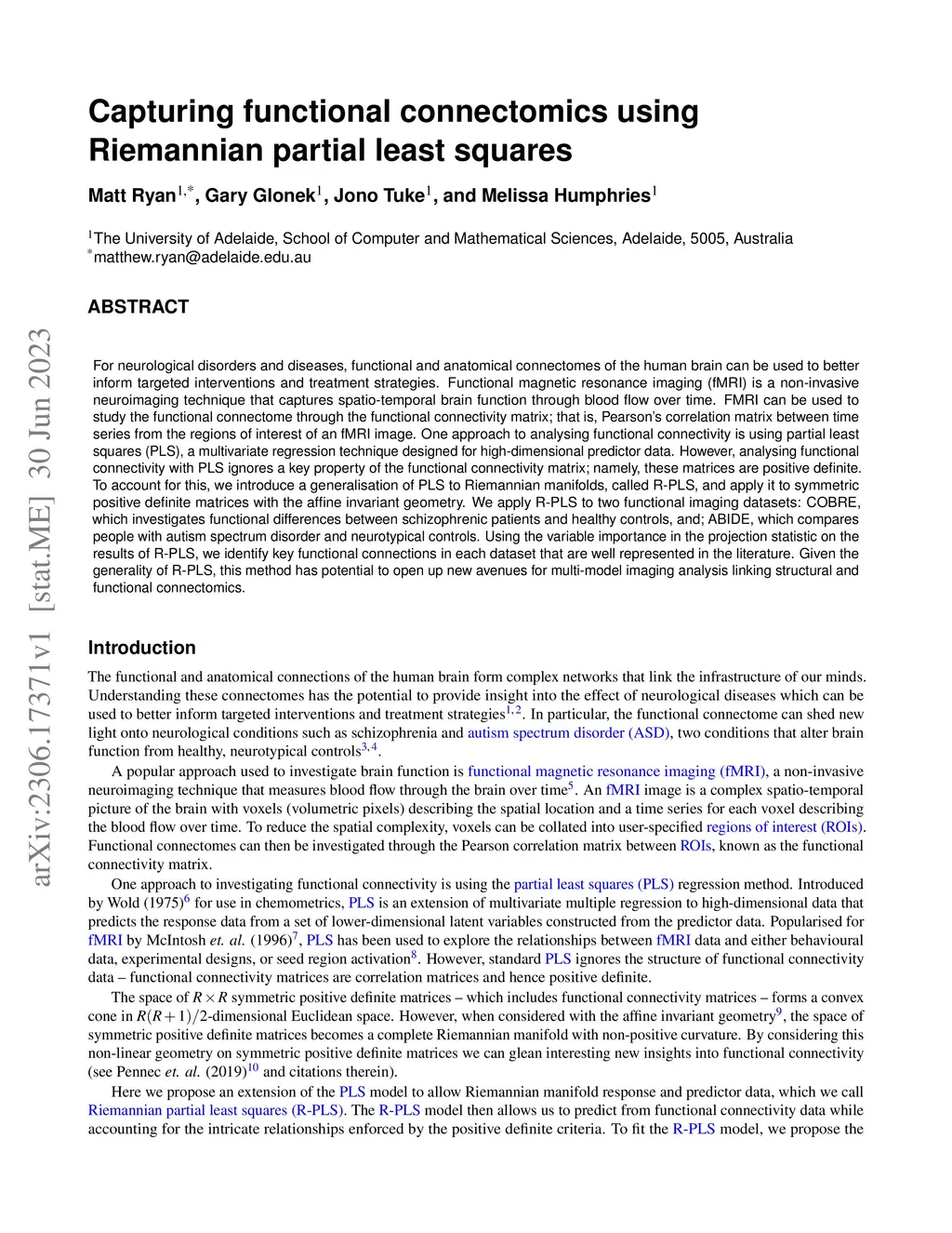 For neurological disorders and diseases, functional and anatomical connectomes of the human brain can be used to better inform targeted interventions and treatment strategies. Functional magnetic resonance imaging (fMRI) is a non-invasive neuroimaging technique that captures spatio-temporal brain function through blood flow over time. FMRI can be used to study the functional connectome through the functional connectivity matrix; that is, Pearson's correlation matrix between time series from the regions of interest of an fMRI image. One approach to analysing functional connectivity is using partial least squares (PLS), a multivariate regression technique designed for high-dimensional predictor data. However, analysing functional connectivity with PLS ignores a key property of the functional connectivity matrix; namely, these matrices are positive definite. To account for this, we introduce a generalisation of PLS to Riemannian manifolds, called R-PLS, and apply it to symmetric positive definite matrices with the affine invariant geometry. We apply R-PLS to two functional imaging datasets: COBRE, which investigates functional differences between schizophrenic patients and healthy controls, and; ABIDE, which compares people with autism spectrum disorder and neurotypical controls. Using the variable importance in the projection statistic on the results of R-PLS, we identify key functional connections in each dataset that are well represented in the literature. Given the generality of R-PLS, this method has potential to open up new avenues for multi-model imaging analysis linking structural and functional connectomics.