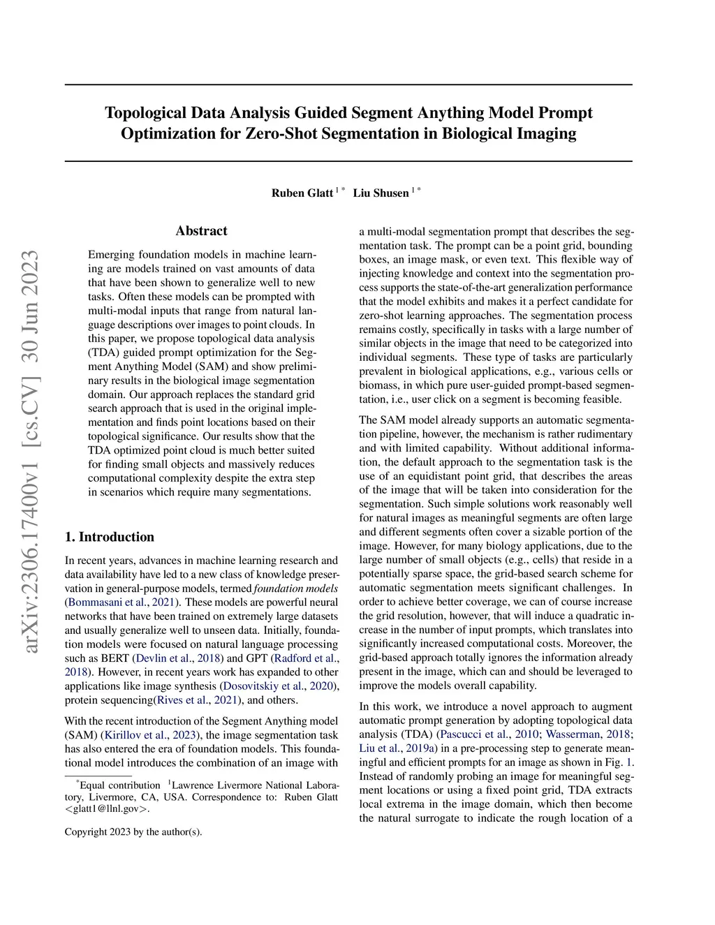 Emerging foundation models in machine learning are models trained on vast amounts of data that have been shown to generalize well to new tasks. Often these models can be prompted with multi-modal inputs that range from natural language descriptions over images to point clouds. In this paper, we propose topological data analysis (TDA) guided prompt optimization for the Segment Anything Model (SAM) and show preliminary results in the biological image segmentation domain. Our approach replaces the standard grid search approach that is used in the original implementation and finds point locations based on their topological significance. Our results show that the TDA optimized point cloud is much better suited for finding small objects and massively reduces computational complexity despite the extra step in scenarios which require many segmentations.