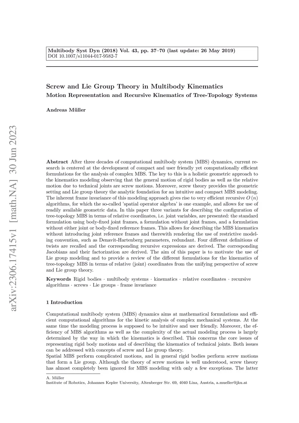 Screw and Lie Group Theory in Multibody Kinematics -- Motion
