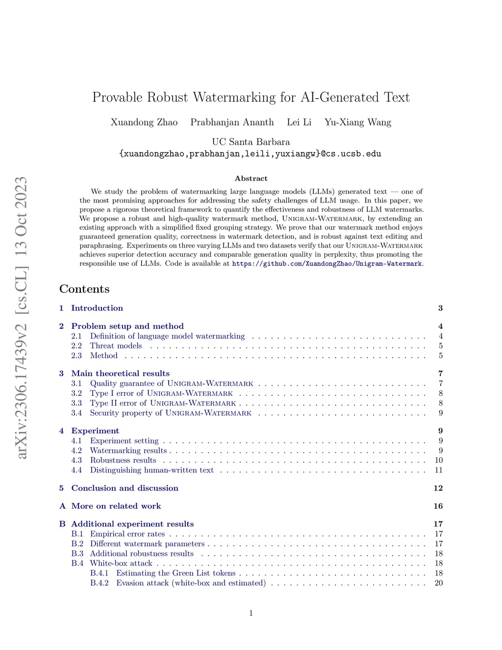 As AI-generated text increasingly resembles human-written content, the ability to detect machine-generated text becomes crucial. To address this challenge, we present GPTWatermark, a robust and high-quality solution designed to ascertain whether a piece of text originates from a specific model. Our approach extends existing watermarking strategies and employs a fixed group design to enhance robustness against editing and paraphrasing attacks. We show that our watermarked language model enjoys strong provable guarantees on generation quality, correctness in detection, and security against evasion attacks. Experimental results on various large language models (LLMs) and diverse datasets demonstrate that our method achieves superior detection accuracy and comparable generation quality in perplexity, thus promoting the responsible use of LLMs.