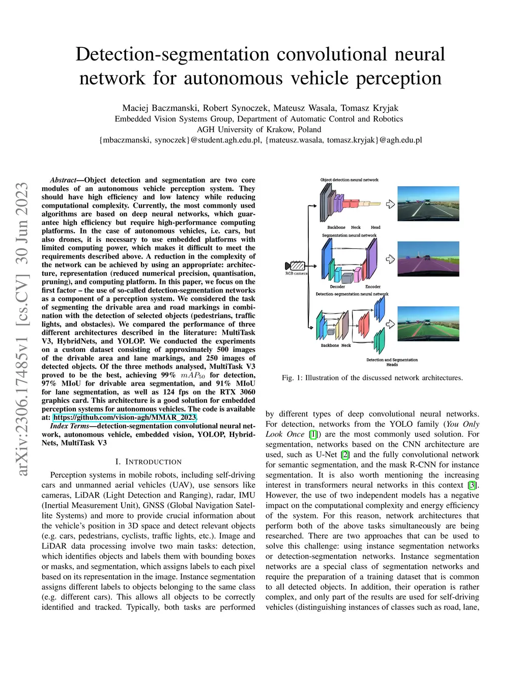Object detection and segmentation are two core modules of an autonomous vehicle perception system. They should have high efficiency and low latency while reducing computational complexity. Currently, the most commonly used algorithms are based on deep neural networks, which guarantee high efficiency but require high-performance computing platforms. In the case of autonomous vehicles, i.e. cars, but also drones, it is necessary to use embedded platforms with limited computing power, which makes it difficult to meet the requirements described above. A reduction in the complexity of the network can be achieved by using an appropriate: architecture, representation (reduced numerical precision, quantisation, pruning), and computing platform. In this paper, we focus on the first factor - the use of so-called detection-segmentation networks as a component of a perception system. We considered the task of segmenting the drivable area and road markings in combination with the detection of selected objects (pedestrians, traffic lights, and obstacles). We compared the performance of three different architectures described in the literature: MultiTask V3, HybridNets, and YOLOP. We conducted the experiments on a custom dataset consisting of approximately 500 images of the drivable area and lane markings, and 250 images of detected objects. Of the three methods analysed, MultiTask V3 proved to be the best, achieving 99% mAP_50 for detection, 97% MIoU for drivable area segmentation, and 91% MIoU for lane segmentation, as well as 124 fps on the RTX 3060 graphics card. This architecture is a good solution for embedded perception systems for autonomous vehicles. The code is available at: https://github.com/vision-agh/MMAR_2023.
