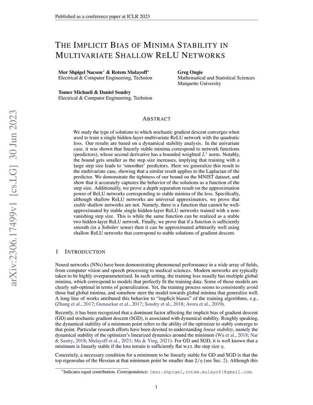 We study the type of solutions to which stochastic gradient descent converges when used to train a single hidden-layer multivariate ReLU network with the quadratic loss. Our results are based on a dynamical stability analysis. In the univariate case, it was shown that linearly stable minima correspond to network functions (predictors), whose second derivative has a bounded weighted norm. Notably, the bound gets smaller as the step size increases, implying that training with a large step size leads to `smoother' predictors. Here we generalize this result to the multivariate case, showing that a similar result applies to the Laplacian of the predictor. We demonstrate the tightness of our bound on the MNIST dataset, and show that it accurately captures the behavior of the solutions as a function of the step size. Additionally, we prove a depth separation result on the approximation power of ReLU networks corresponding to stable minima of the loss. Specifically, although shallow ReLU networks are universal approximators, we prove that stable shallow networks are not. Namely, there is a function that cannot be well-approximated by stable single hidden-layer ReLU networks trained with a non-vanishing step size. This is while the same function can be realized as a stable two hidden-layer ReLU network. Finally, we prove that if a function is sufficiently smooth (in a Sobolev sense) then it can be approximated arbitrarily well using shallow ReLU networks that correspond to stable solutions of gradient descent.