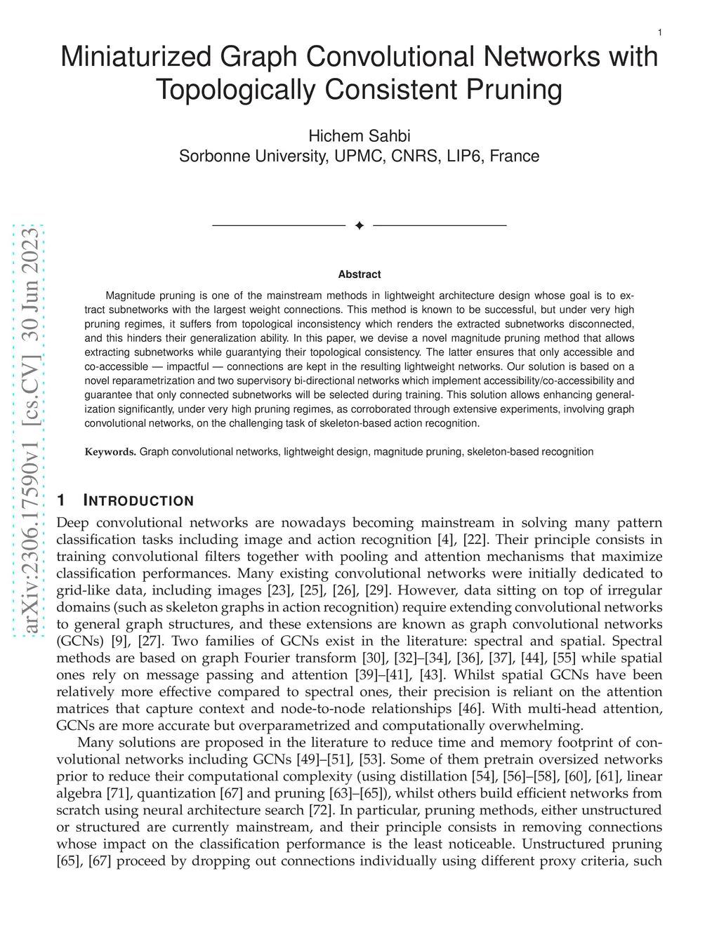 Magnitude pruning is one of the mainstream methods in lightweight architecture design whose goal is to extract subnetworks with the largest weight connections. This method is known to be successful, but under very high pruning regimes, it suffers from topological inconsistency which renders the extracted subnetworks disconnected, and this hinders their generalization ability. In this paper, we devise a novel magnitude pruning method that allows extracting subnetworks while guarantying their topological consistency. The latter ensures that only accessible and co-accessible -- impactful -- connections are kept in the resulting lightweight networks. Our solution is based on a novel reparametrization and two supervisory bi-directional networks which implement accessibility/co-accessibility and guarantee that only connected subnetworks will be selected during training. This solution allows enhancing generalization significantly, under very high pruning regimes, as corroborated through extensive experiments, involving graph convolutional networks, on the challenging task of skeleton-based action recognition.