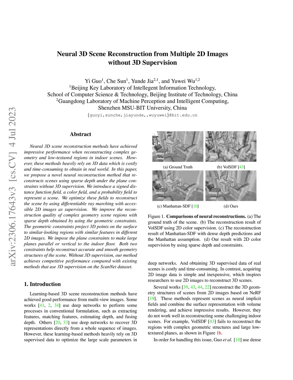 Neural 3D scene reconstruction methods have achieved impressive performance when reconstructing complex geometry and low-textured regions in indoor scenes. However, these methods heavily rely on 3D data which is costly and time-consuming to obtain in real world. In this paper, we propose a novel neural reconstruction method that reconstructs scenes using sparse depth under the plane constraints without 3D supervision. We introduce a signed distance function field, a color field, and a probability field to represent a scene. We optimize these fields to reconstruct the scene by using differentiable ray marching with accessible 2D images as supervision. We improve the reconstruction quality of complex geometry scene regions with sparse depth obtained by using the geometric constraints. The geometric constraints project 3D points on the surface to similar-looking regions with similar features in different 2D images. We impose the plane constraints to make large planes parallel or vertical to the indoor floor. Both two constraints help reconstruct accurate and smooth geometry structures of the scene. Without 3D supervision, our method achieves competitive performance compared with existing methods that use 3D supervision on the ScanNet dataset.