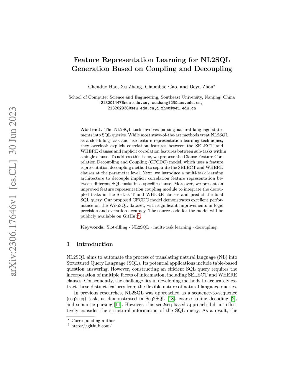 The NL2SQL task involves parsing natural language statements into SQL queries. While most state-of-the-art methods treat NL2SQL as a slot-filling task and use feature representation learning techniques, they overlook explicit correlation features between the SELECT and WHERE clauses and implicit correlation features between sub-tasks within a single clause. To address this issue, we propose the Clause Feature Correlation Decoupling and Coupling (CFCDC) model, which uses a feature representation decoupling method to separate the SELECT and WHERE clauses at the parameter level. Next, we introduce a multi-task learning architecture to decouple implicit correlation feature representation between different SQL tasks in a specific clause. Moreover, we present an improved feature representation coupling module to integrate the decoupled tasks in the SELECT and WHERE clauses and predict the final SQL query. Our proposed CFCDC model demonstrates excellent performance on the WikiSQL dataset, with significant improvements in logic precision and execution accuracy. The source code for the model will be publicly available on GitHub