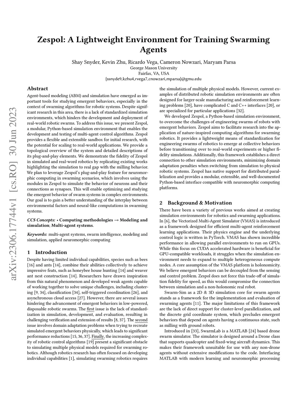 Agent-based modeling (ABM) and simulation have emerged as important tools for studying emergent behaviors, especially in the context of swarming algorithms for robotic systems. Despite significant research in this area, there is a lack of standardized simulation environments, which hinders the development and deployment of real-world robotic swarms. To address this issue, we present Zespol, a modular, Python-based simulation environment that enables the development and testing of multi-agent control algorithms. Zespol provides a flexible and extensible sandbox for initial research, with the potential for scaling to real-world applications. We provide a topological overview of the system and detailed descriptions of its plug-and-play elements. We demonstrate the fidelity of Zespol in simulated and real-word robotics by replicating existing works highlighting the simulation to real gap with the milling behavior. We plan to leverage Zespol's plug-and-play feature for neuromorphic computing in swarming scenarios, which involves using the modules in Zespol to simulate the behavior of neurons and their connections as synapses. This will enable optimizing and studying the emergent behavior of swarm systems in complex environments. Our goal is to gain a better understanding of the interplay between environmental factors and neural-like computations in swarming systems.