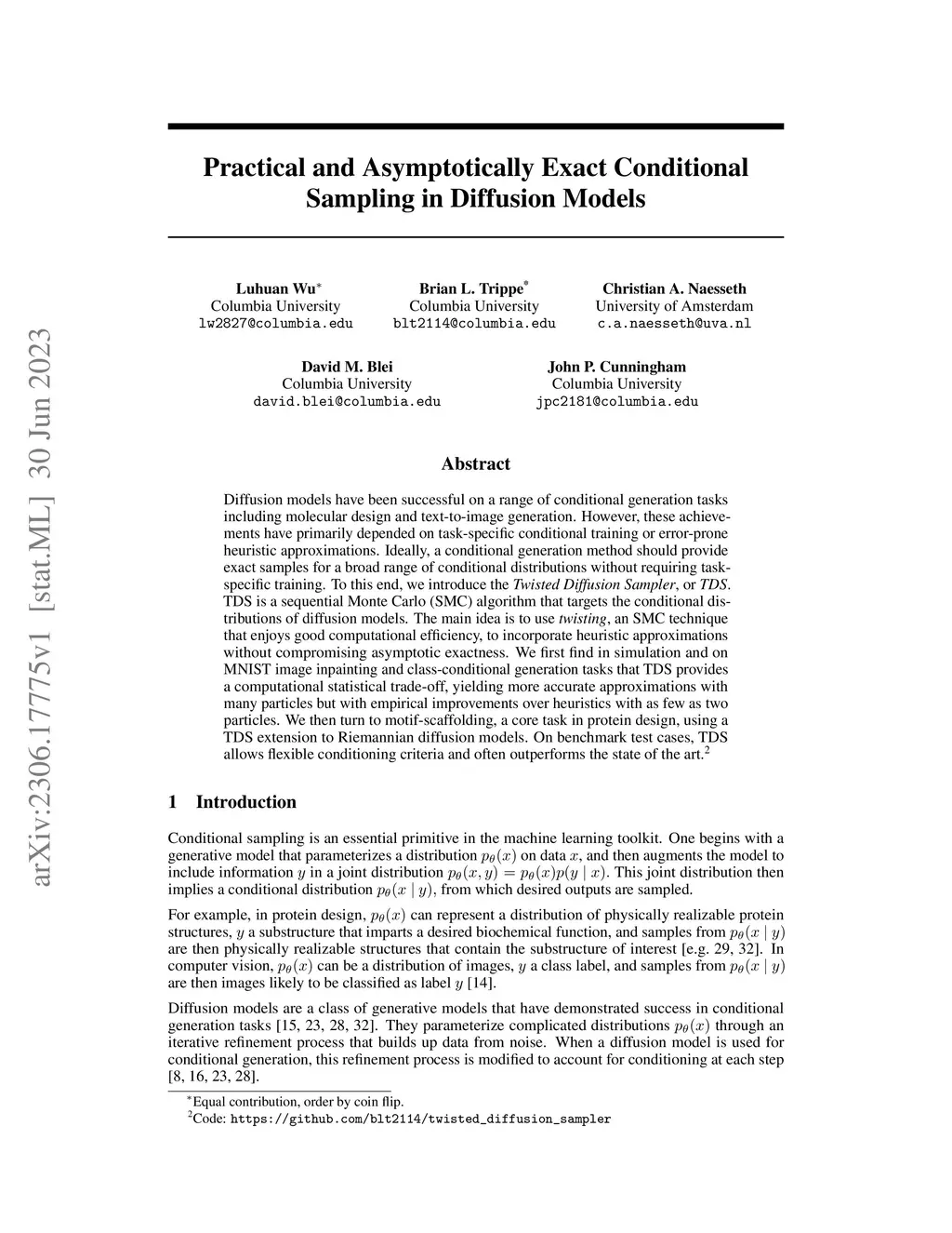 Diffusion models have been successful on a range of conditional generation tasks including molecular design and text-to-image generation. However, these achievements have primarily depended on task-specific conditional training or error-prone heuristic approximations. Ideally, a conditional generation method should provide exact samples for a broad range of conditional distributions without requiring task-specific training. To this end, we introduce the Twisted Diffusion Sampler, or TDS. TDS is a sequential Monte Carlo (SMC) algorithm that targets the conditional distributions of diffusion models. The main idea is to use twisting, an SMC technique that enjoys good computational efficiency, to incorporate heuristic approximations without compromising asymptotic exactness. We first find in simulation and on MNIST image inpainting and class-conditional generation tasks that TDS provides a computational statistical trade-off, yielding more accurate approximations with many particles but with empirical improvements over heuristics with as few as two particles. We then turn to motif-scaffolding, a core task in protein design, using a TDS extension to Riemannian diffusion models. On benchmark test cases, TDS allows flexible conditioning criteria and often outperforms the state of the art.