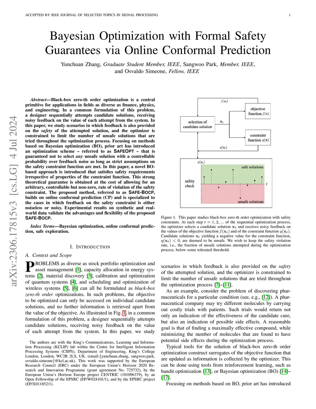 Black-box zero-th order optimization is a central primitive for applications in fields as diverse as finance, physics, and engineering. In a common formulation of this problem, a designer sequentially attempts candidate solutions, receiving noisy feedback on the value of each attempt from the system. In this paper, we study scenarios in which feedback is also provided on the safety of the attempted solution, and the optimizer is constrained to limit the number of unsafe solutions that are tried throughout the optimization process. Focusing on methods based on Bayesian optimization (BO), prior art has introduced an optimization scheme -- referred to as SAFEOPT -- that is guaranteed not to select any unsafe solution with a controllable probability over feedback noise as long as strict assumptions on the safety constraint function are met. In this paper, a novel BO-based approach is introduced that satisfies safety requirements irrespective of properties of the constraint function. This strong theoretical guarantee is obtained at the cost of allowing for an arbitrary, controllable but non-zero, rate of violation of the safety constraint. The proposed method, referred to as SAFE-BOCP, builds on online conformal prediction (CP) and is specialized to the cases in which feedback on the safety constraint is either noiseless or noisy. Experimental results on synthetic and real-world data validate the advantages and flexibility of the proposed SAFE-BOCP.